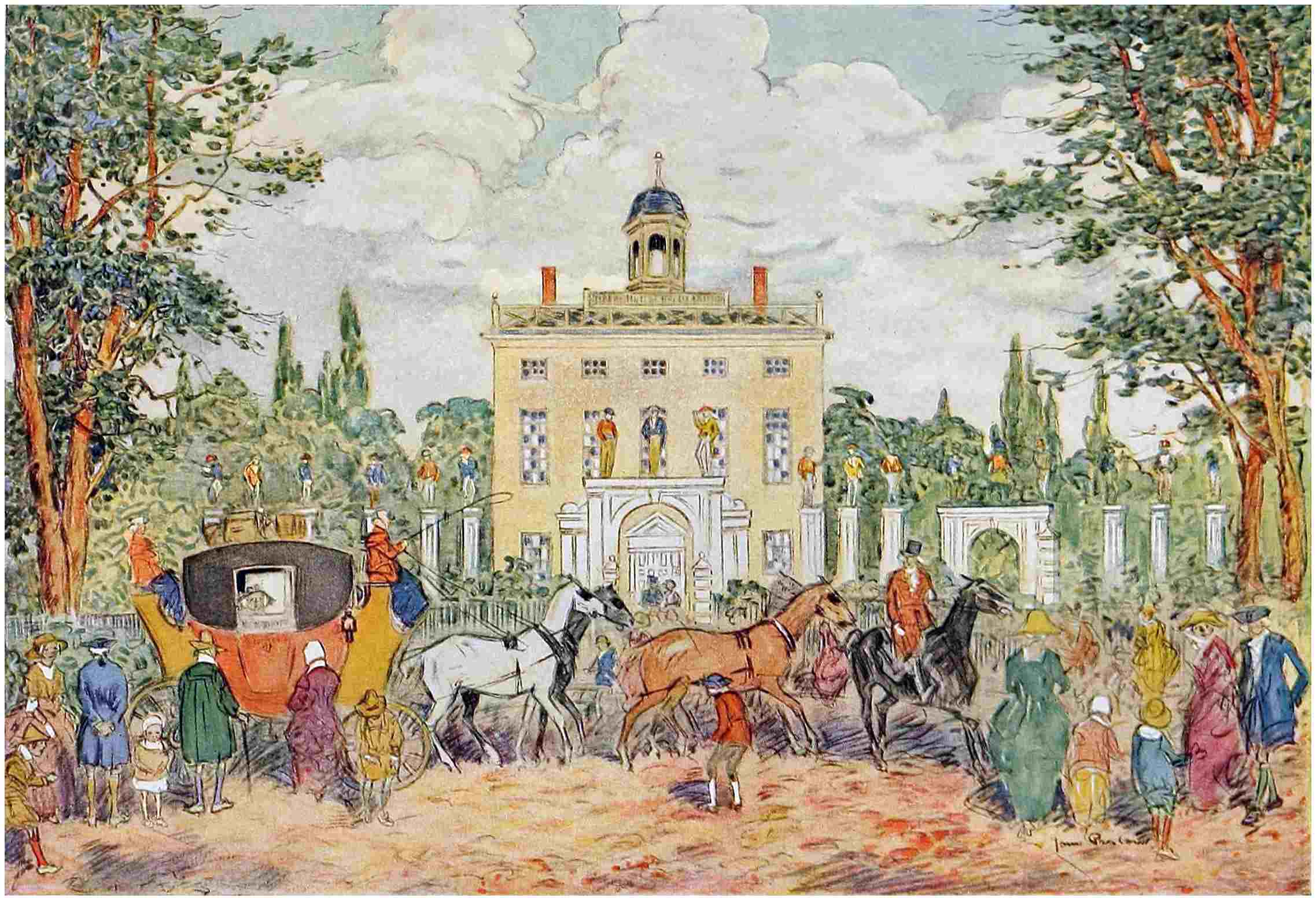 In the face of mutterings of anarchy—that Russian importation which is so much less satisfactory than the caviar—there is reassurance in these sturdy calm old mansions which are the monuments of the sturdy calm old patriots who raised them—men having a rare sense of proportion which they exercised not only in building their houses but in building the nation on lines equally clean, sound and beautiful. Fancy a shaggy Bolshevik, his mouth full of broken English, his head full of sophistry, and his heart full of greed for the possessions of others, being led up Mount Vernon, Monticello or Doughoregan Manor! Could any contrast make a picture more grotesque? Could there be conceived a background more serenely sane, more perfectly American, against which to display the distortion of this foreign madness? Every stone and brick and timber of such houses preaches a sermon on Americanism.