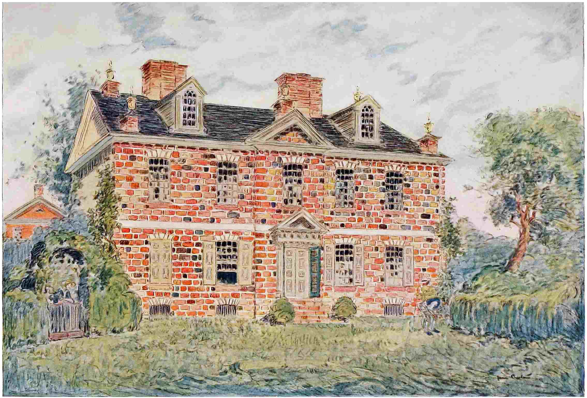 The census of the twelve houses described and pictured in this book is worth completing. One, Mount Vernon, is, as I have said, owned by an organization of patriotic women; two are owned by their municipalities and are cared for by patriotic organizations; one only is the home of a lineal descendant and namesake of the builder—though three others belong to persons having in their veins blood of the first masters of their houses. And one—a most interesting, but not historic house—is a poor battered tenement. Seven of the houses are situated in Northern States, one in a Border State, and four are in the South. The builders of two of the houses, the first and third Presidents of the United States, are buried on the grounds nearby, and in one case the builder is buried under the chancel of a private chapel, a part of the house itself.