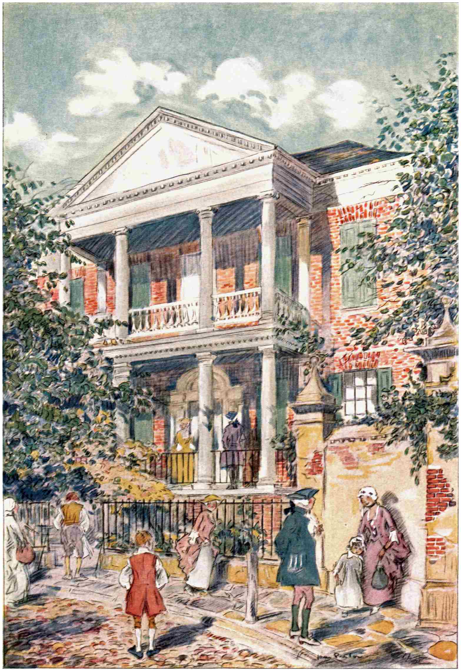 If Charleston really knew what was expected of her in dramatic ritual she would do all those things. Happily Charleston does not know, or she might exploit and become odious. Instead she watches the cloth-of-gold roses climb the courtyard wall and is much more concerned with the forthcoming blossoms than with the ancestor who planted the roots. She has a back-drop as glorious as an old tapestry, but it is hung where it belongs—back. She attends St. Michael’s and St. Philip’s for today’s devotions and tomorrow’s salvation, which160 are the richer for yesterday’s haunting footsteps. And only Charleston can truly appreciate—though the rest of the nation may admire and cherish—the old square house in King Street whose red-brick walls and shining white portico are framed by ancient trees at the curbing; the house Miles Brewton built; the house Charleston knows as the “Pringle House.”