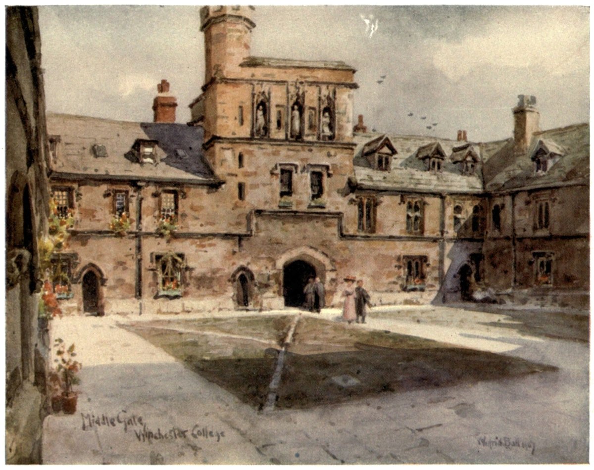 Where else but in Winchester can we meet with so many picturesque reminders of an ancient feudal past,—reminders which have survived not because they are merely picturesque, but simply because here they have not outlived their usefulness or natural appropriateness? The Cathedral bedesmen, the brethren of St. Cross, the scholars of ‘Sainte Marie College,’ the almsmen of Beaufort’s Order of Noble Poverty, the brethren of Christe’s Hospitall, the masters of the College, and the college queristers also, the ecclesiastical dignitaries of the diocese with their quaintly uncomfortable attire,—each and all of these wear their distinctive garb as a matter of course, just as centuries ago every one wore the garb distinctive of his rank or occupation. Anywhere else one of these might excite remark: here they pass unnoticed. They are part of the place, part of the spirit of the past, which, dead elsewhere, here survives in vigour and undiminished vitality.