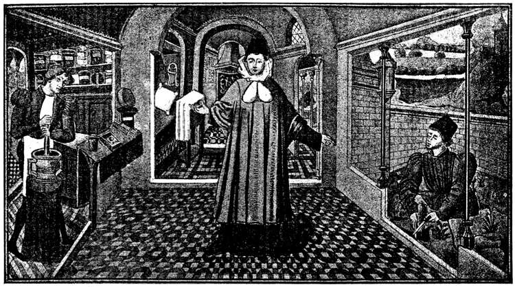 [65] The distinguishing sign of the barbers was the shaving dish, made of pewter and hung up at the door of the shop; that employed by the surgeons was also a shaving dish, but made of polished brass. Those surgeons who had received their training at the school of Saint Cosmas and Saint Damian were permitted to display at the window a banner bearing the coat of arms of this institution.
