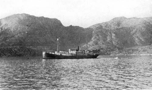 In the meanwhile the Peary had arrived to load on the remaining plane, and we got under weigh for Karna to return E-took-a-shoo to his home. On the way to Karna we had to sail through a long stretch of uncharted water. The[118] Commander had scrutinized it from the air, and apparently it was safe and free from obstructions.