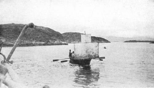The wind was still blowing with great force, so hard in fact that I shut down the motor and rigged a sail with a tarpaulin and an oar, which made the boat go even faster than it did with the motor. In a few moments we were through the channel and bound up the coast for Cape Hatherton. For several hours we continued under sail until at last we were pretty close to the Cape. We then cut in for the shore and made our way through loose ice to the beach.[111] We landed at five o’clock in the morning after a rather exciting voyage, to say the least.
