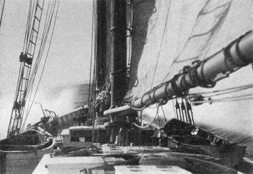 Soon the Commander, Dick and Melkon returned from forward, and we settled down to ride it out as best we might. Suddenly an ominous slatting sounded through the shrill scream of the wind in the rigging. Holding our hands before our faces to shield them from the cutting spray, we fought our way forward to investigate. A hasty glance revealed that our foresail had[137] been blown loose from the gaff laceline. This was a dangerous situation as the sail was likely to thrash to pieces. The Commander immediately gave the word to call all hands. In a moment Robbie came piling up from the cabin, and under his direction we started to haul down the sail. The Commander held the vessel in the wind while we labored. Five of us seized the downhaul, but we were ineffectually dragged back and forth across the deck by the terrible thrashing of the sail. At last I managed to catch a turn over a belaying pin, and then inch by inch we swayed it down. Luck was with us, and down it came without tearing. We were greatly relieved to have this important sail safe on deck with no further damage than the broken laceline. It required fast work to save it. This filled out an active and exciting evening.