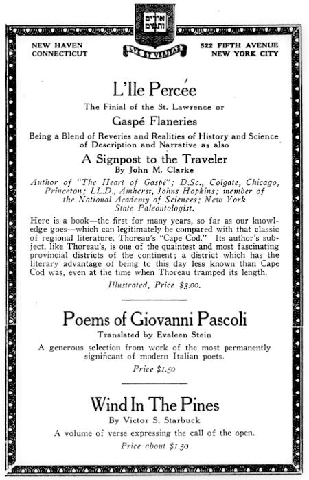 Yet this taking of Nature as she is, despite the fact that Mr. Robinson calls the theme a “good deal of a mix up”, in no wise complicates the bare plot. Roman Bartholow, an ailing descendant of an old Maine family, is brought to know again the joy of life by acquaintance with a man that comes to visit him and forgets to go away. This Penn-Raven, though he works a cure for Bartholow, succeeds in doing the opposite for Roman’s wife. He falls in love with her and, before the opening of the poem, has for some time possessed her adequately. Gabrielle is a peculiar[257] character, but let it suffice here to say that the liaison with Penn-Raven is no answer to her problem. In Bartholow she married the wrong man, and the Raven she comes to find intolerable. She is one who has always suffered disappointments. It is no wonder, therefore, that, realizing she cannot fully enter into Bartholow’s renascence as he would have her do, in an effort to save for him his new-found light she drowns herself. Thenceforward the solution is cruelly plain. Bartholow, unaware of Gabrielle’s act and provoked by Penn-Raven, pays him to leave the house. Word is then brought that Gabrielle is drowned. That is in midsummer. It is fall when Bartholow himself leaves the house forever to go whither he will, cherishing the light of his regeneration the while he thinks of Gabrielle who couldn’t follow his rebirth, not being reborn in his manner, and who threw herself away.