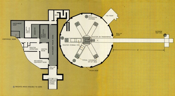 This building is a windowless, circular structure with aluminum siding. Inside, the building is 100 feet in diameter and 65 feet high. There is a roll-up door in the south wall for the passage of the reactor transporter to the outdoor test site and another in the west wall for the access of vehicles to the building. A shielded stairway and maze provides access from the underground Control Building. This concrete structure provides radiological shielding for the personnel and controls associated with the operation of the reactor and the conduct of experiments.