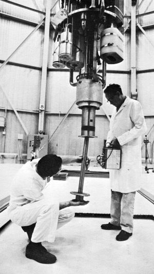 The design of the APRF is a direct outgrowth of projected user requirements. Thus the reactor can be used both for high dose irradiations of small objects, as a point source for radiation detector studies, and irradiation of bulk objects. The former requirement led to the incorporation of a 1½-inch OD “glory hole” running through the center of the core, and providing a fast neutron fluence of about 9 × 10¹⁴ neutrons per square centimeter per pulse. The latter two requirements have resulted in the design of a large volume, low-radiation backscatter Reactor Building. Provision is made for moving the reactor both within the Reactor Building and to an outdoor test site at heights variable up to 44 feet above ground by means of a mechanical device called the reactor transporter. The reactor is also capable of intermittent steady state operation in the kilowatt range for classes of experiments requiring this mode of operation. [Pg 4]
