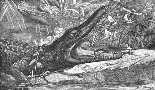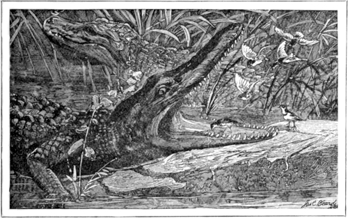 “A sail, or the smoke and noise of a steamboat, suffice to warn the crocodiles basking on the sand-banks, or their common companions, the black-headed and spur-winged plovers (Pluvianus ægyptius and Hoplopterus spinosus), which are frequently seen perched on their backs, and always prepared to give timely warning of approaching danger, just as the Father of History noticed them 2300 years ago, and, strange to say, his well-known story is current among the modern Egyptians, who, as usual, have put a tail to the narrative. They say, that in addition to its office of leech-catcher to the crocodile, it occasionally does happen that the zic-zac—so called from its note of alarm—in searching for the leeches, finds its way into the reptile’s mouth when the latter is basking on a sand-bank, where it lies generally with the jaws wide apart. Now this is possible and [Pg 578]likely enough, but the captain of our boat added, that occasionally the crocodile falls asleep, when the jaws suddenly fall, and the zic-zac is shut up in the mouth, when it immediately prods the crocodile with its horny spurs, as if refreshing the memory of his reptilian majesty, who opens his jaws and sets his favourite leech-catcher at liberty” (Leith Adams).