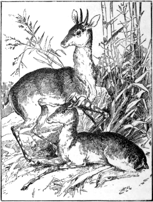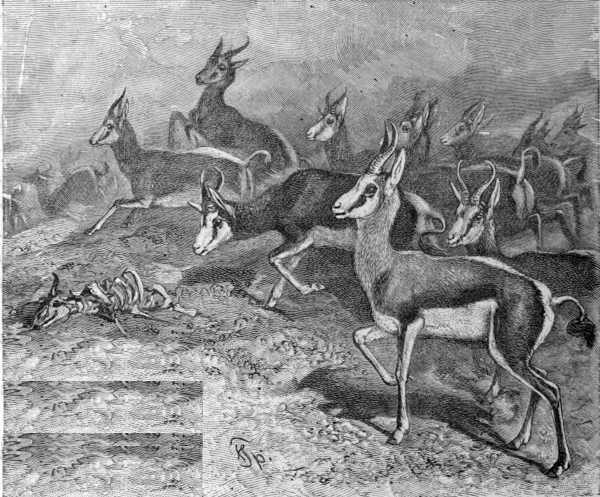 “I beheld the plains and even the hillsides which stretched on every side of me thickly covered, not with herds, but with one vast mass of springboks; as far as the eye could strain the landscape was alive with them, until they softened down into a dim red mass of living creatures. To endeavour to form any idea of the number of antelopes which I had that day beheld were vain, but I have no hesitation in saying that some hundreds of thousands were within the compass of my vision.”—Gordon Cumming. With this should be compared what other sportsmen and travellers have in recent years told us of rapidly diminishing numbers.