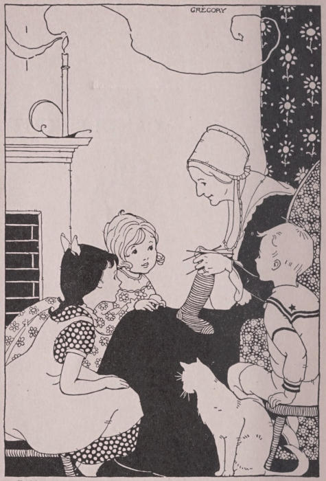 Grandma opened the door immediately and the children stepped in—then stared in astonishment. They had never seen a room like this before. In place of the blue rug was a gayly colored rag carpet. The bed, to which had been added a feather tick, was twice as high as any they had ever seen. It was covered with a handmade coverlet of blue and white. Patchwork cushions were on the chairs, and crocheted covers on bureau and chiffonier. The windows were filled with blooming geraniums, and in one window hung a canary in a gilt cage. On a round braided rug before the fire lay a gray cat, asleep. By a low rocker stood a little table that held a work basket running over with bright-colored patches, bits of lace, balls of scarlet yarn, knitting needles, pieces of velvet, silk, and wool. On the chiffonier stood a basket filled with big, red apples, polished till they shone, and beside the apples was a plate covered with a napkin.
