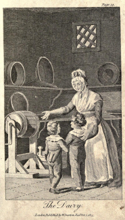 Mrs. Mansfield, hearing how much her little grandsons had been pleased with the cows, after breakfast took them into the dairy, to show them what was done with the milk which those useful animals give in such large quantities. The dairy was a little room with a brick floor, facing the north, and kept very cool, by means of a latticed window that let in fresh air. It was necessary that it should be built in that way, because heat[13] soon turns milk sour. Round the room were fixed a sort of trays lined with lead, which then were all filled with milk.