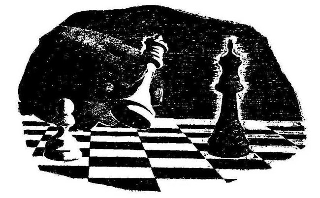 He slid his rook down from one king row to the other through the square formerly covered by the knight which had been protected by a bishop. All the way across the board he went, and as he arrived at his opponent's king row, he took out the little sign and stood it on the center of the board.