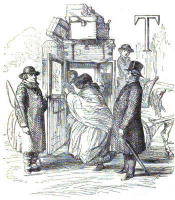 I saw at once that she was the mother of those children, and going to part from them. Perhaps I have tried parting with my own, and not found the business very pleasant. Perhaps I recollect driving down (with a certain trunk and carpet-bag on the box) with my own mother to the end of the avenue, where we waited—only a few minutes—until the whirring wheels of that “Defiance” coach were heard rolling towards us[383] as certain as death. Twang goes the horn; up goes the trunk; down come the steps. Bah! I see the autumn evening: I hear the wheels now: I smart the cruel smart again: and, boy or man, have never been able to bear the sight of people parting from their children.