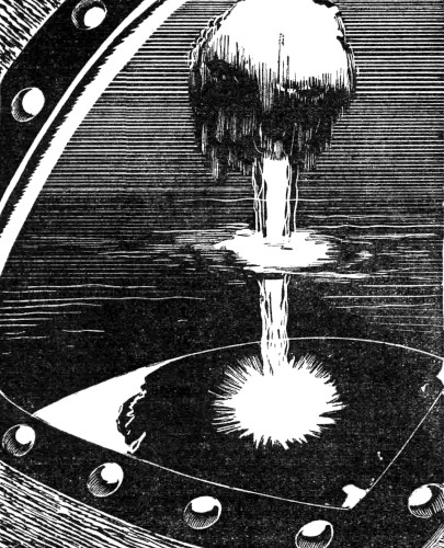He was interrupted by the ka-plunking sound in the speaker. It was a cross, in sound, between plucking a screen door spring and dropping a boulder into a placid lagoon. A blinding flash of light burst against the dark sky, an expanding ball of flame raced skyward and died in a faintly luminous cloud that boiled upwards to a terrific height. Immediately afterwards, the ground shook madly. The counting-rate meter chattered and screeched as it overloaded and the radiation identifier winked furiously on all pilot lights, indicating all kinds of possible radiation. The pale actinic glow on the walls of the squat buildings flamed bright, wavered, flickered, paled again, and went out for good. The area and the ship was pelted with a fine rain of dirt, pebbles, and fused glass.