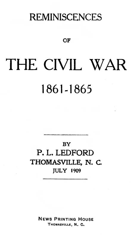The following pages written by a plain confederate soldier who spent three years in the war instead of at college are submitted to the public upon the merits of the information given, without claiming any literary merit. Feeling that I am performing an imperative duty that I owe to the cause and my country, I respectfully dedicate the reminiscences to the soldiers of the late war who were my comrades while passing through the trying ordeal.