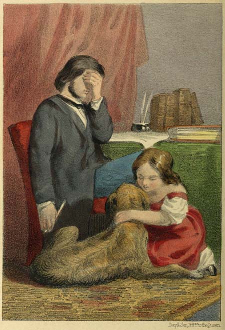 She looked into his face with eyes beaming with love and gratitude; but the joyful, sparkling expression soon faded away, for she saw that he was sadder than usual; and with the quick sympathy and natural grace of childhood she sat down quietly on the rug, and taking the stately head of the hound on her lap, pensively stroked his long, shaggy coat. Presently she ventured to break the silence in her gentle way—“I am so glad you are come back, sir; I have missed you so!”