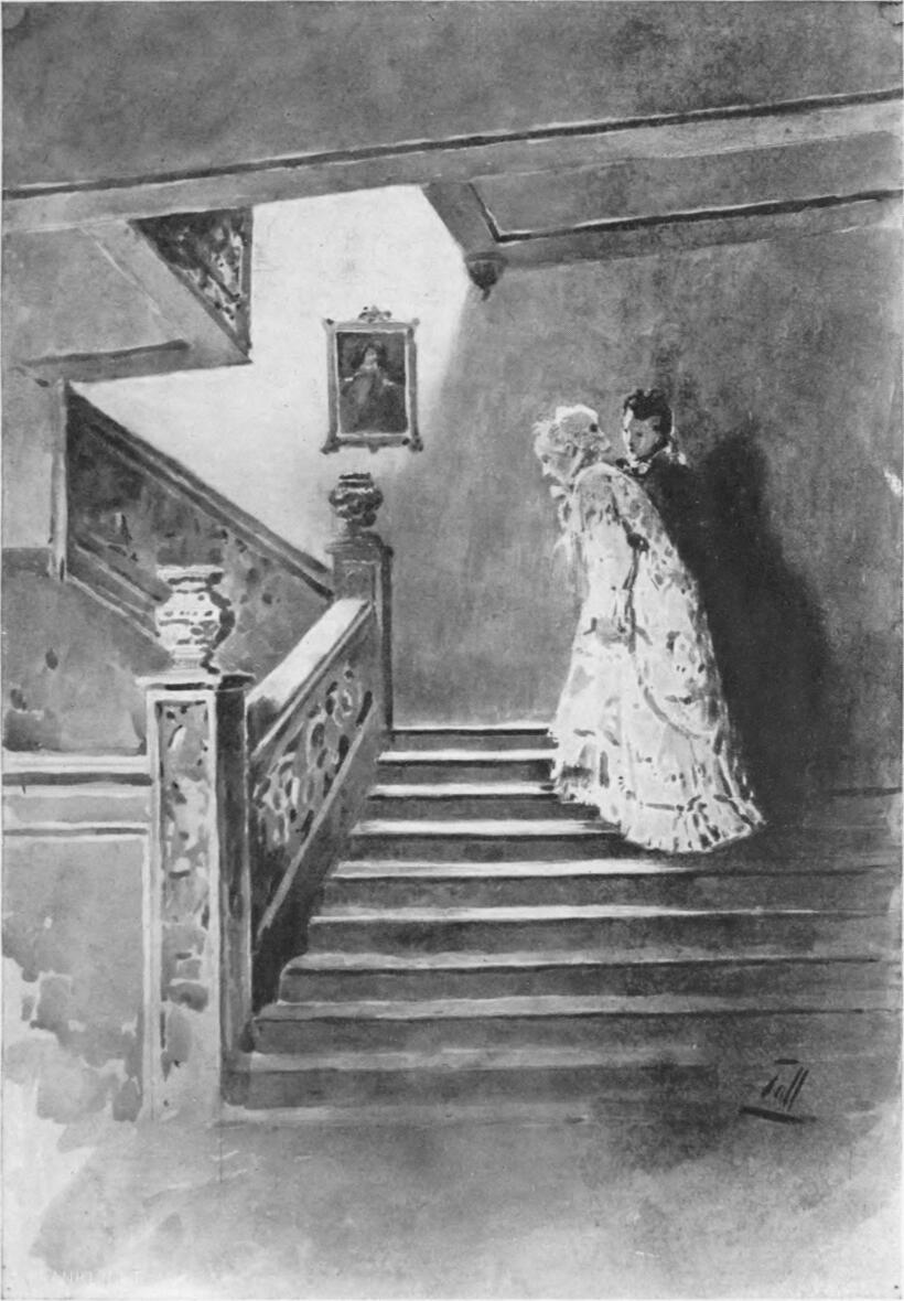 Majd a nagyasszony következett. Talpig gyászban, fején sugárzó koronaszerű diadém, a melynek fátyola hosszan huzódott utána, ő a Klienigstein karjára támaszkodott, ki a kamarási díszben lépdelt. Aztán Niffor Tomi vezeti az öreg herczegnét, ki nagy krinolinban, hosszú Mária Terézia fürtjeivel, magasra fésült hajjal úgy néz ki, mintha a XIV-ik Lajos udvarából szakadt volna ide. Aztán Pepi herczegné Bálványossy Lajos karján, Bálványossyné Márfay Nikivel, majd a nyoszolyólányok a XVI-ik század köntöseiben.