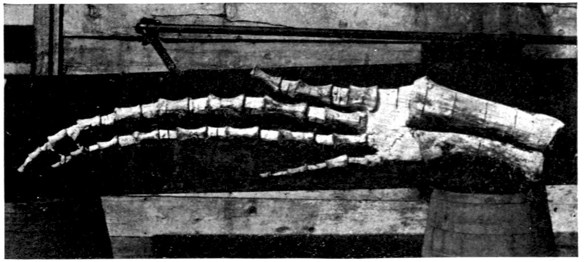 The bones of the fore-limbs of ordinary mammals are 318present in the cetacean flipper, but they become greatly flattened and overlaid with adipose tissue to form a paddle. In the right whales the five fingers of the mammalian hand are present, but in others one finger has been lost, and the digits are greatly elongated. The scapula, or shoulder blade, is a wide, flat, fan-shaped bone, and the clavicles, or collarbones, have entirely disappeared. The hind-limbs are rudimentary, when present at all, only being represented by bony nodules, and the pelvis is reduced to two spindle-shaped bones quite unlike that of land mammals.
