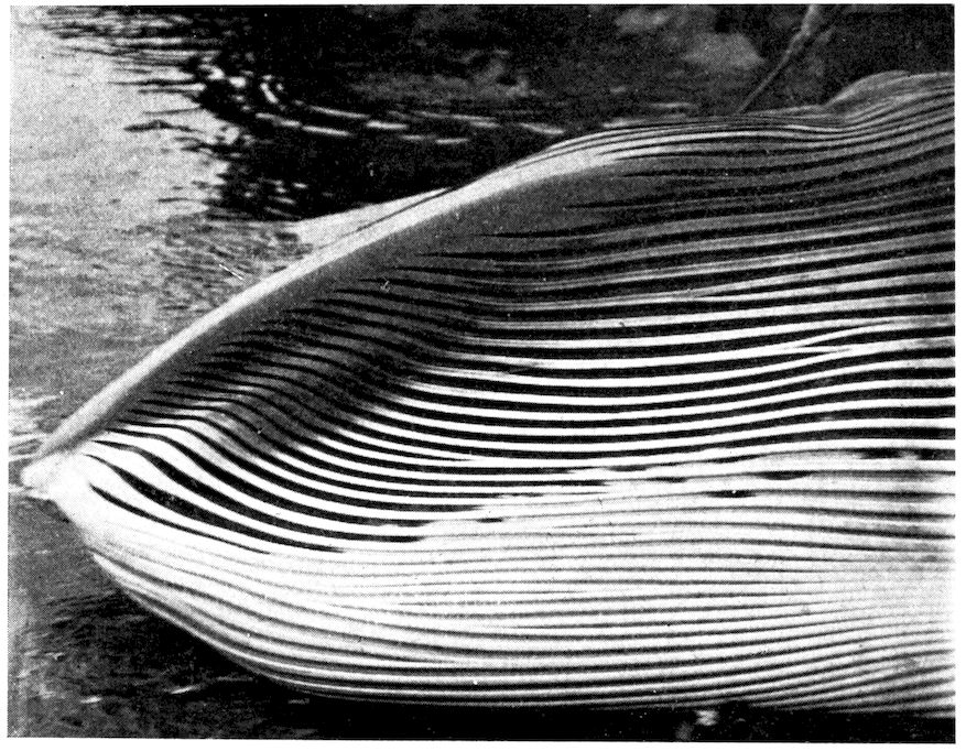 The color of the head and back is dark gray; on the sides and flanks the gray of the back becomes lighter and the flanks are beautifully marked with wavy gray lines. The throat and breast are white, but a wide dark gray band runs across the belly. The ventral line from the anus to the flukes is gray. The pectoral fins above and below are dark 311gray, but somewhat lighter on the anterior half of the under side. The flukes above are dark gray like the back, and below are light gray in the ventral portion, becoming darker on the edges. The whalebone is bluish-black with white bristles.