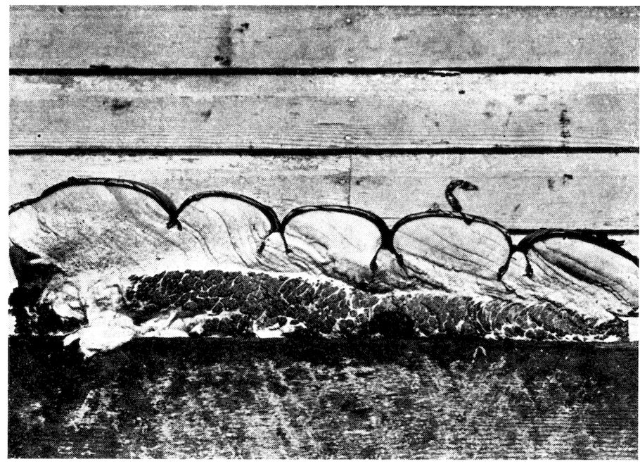 320In all cetaceans the facial portion of the skull is greatly elongated, and especially in the Mystacoceti the mouth is exceedingly large to accommodate the baleen, which hangs in two parallel rows from the upper jaw. Probably no mammalian adaptation for the securing of food is more remarkable than the whale’s baleen. It is almost unbelievable that an animal which once had teeth could, as its food changed, replace them by a complicated straining apparatus such as the whalebone. The baleen is an epidermal growth and is in reality merely an exaggeration of the transverse ridges present in the mouths of land mammals.