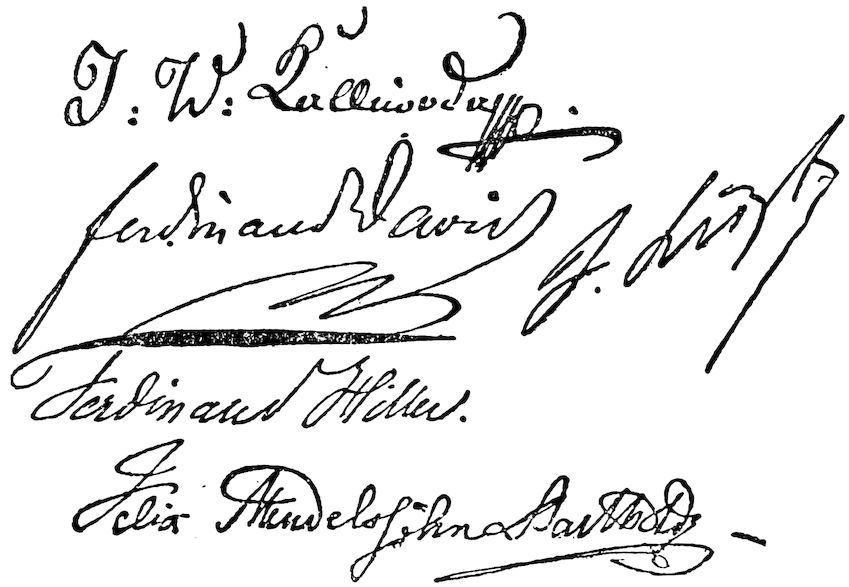 When I was about eleven or twelve, old Schneider allowed me to play with accompaniment of the full orchestra some concertos of Mozart, etc. This was a great event in my quiet life, and everything looked as if music was to be my profession. When afterwards I went to the Nicolai School at Leipzig, the school at which Leibniz (not Leibnitz) had been educated, I lived again in the 13musical house of Professor Carus. His wife sang sweetly; his son, my old friend, Professor V. Carus, was an excellent violin player, a pupil of David. I myself began to play the violoncello, but without much success, and I joined a chorus under Mendelssohn, who was then director of the famous Gewandhaus Concerts at Leipzig. We often had to sing anything he had composed and wished to hear before performing it in public. As a friend of my father and my mother, Mendelssohn was always most charming to me, but he did not encourage my idea of a musical career. The fact was I had not time to serve two masters. I could not practise and study music as it ought to be practised and studied without neglecting Greek and Latin, and, as life became more serious, my mind was more and more drawn to the thoughts of antiquity, to Homer and Cicero, and away from the delights of music. I heard excellent music at the house of Professor Carus. I still have an old slip of paper on which Mendelssohn, Liszt, David, Kalliwoda and Hiller wrote their names for me one evening after they had been playing quartettes at Professor Carus’s house. (See page 14.)