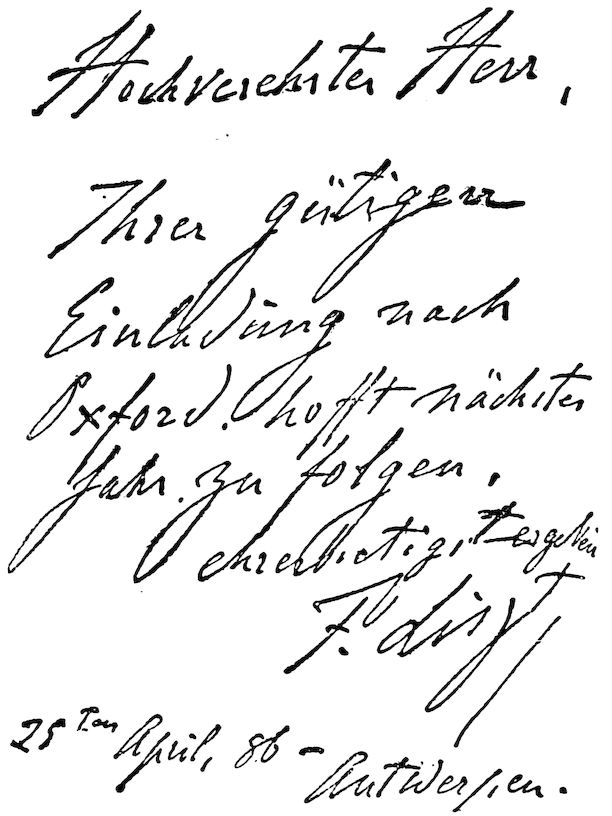 We stood amazed, and after everybody had paid his compliments to the hero of the day, some of Mendelssohn’s friends gathered round him, and said: “Ah, Felix, now we can pack up (‘jetzt 18können wir einpacken’). No one can do that; it is over with us!” Mendelssohn smiled; and when Liszt came up to him asking him to play something in turn, he laughed and said that he never played now; and this, to a certain extent, was true. He did not give much time to practising then, but worked chiefly at composing and directing his concerts. However, Liszt would take no refusal, and so at last little Mendelssohn, with his own charming playfulness, said: “Well, I’ll play, but you must promise me not to be angry.” And what did he play? He sat down and played first of all Liszt’s Hungarian Melody, and then one variation after another, so that no one but Liszt himself could have told the difference. We all trembled lest Liszt should be offended, for Mendelssohn could not keep himself from slightly imitating Liszt’s movements and raptures. However, Mendelssohn managed never to offend man, woman, or child. Liszt laughed and applauded, and admitted that no one, not he himself, could have performed such a bravura. Many years after I saw Liszt once more, at the last visit he paid to London. He came to the Lyceum to see Irving and Ellen Terry act in “Faust.” The whole theatre rose when the old, bent Maestro appeared in the dress circle. When the play was over, I received an invitation from 19Mr., now Sir Henry, Irving to join a supper party in honour of Liszt. I could not resist, though I was staying with friends in London and had no latch-key. It was a brilliant affair. Rooms had been fitted up on purpose with old armour, splendid pictures, gorgeous curtains. We sat down, about thirty people; I knew hardly anybody, though they were all known to fame, and not to know them was to profess oneself unknown. However, I was placed next to Liszt, and I reminded him of those early Leipzig days. He was not in good spirits; he would not speak English, though Ellen Terry sat on his right side, and, as she would not speak German or French, I had to interpret as well as I could, and it was not always easy. At last Miss Ellen Terry turned to me and said: “Tell Liszt that I can speak German,” and when he turned to listen, she said in her girlish, bell-like voice: “Lieber Liszt, ich liebe Dich.” I hope I am not betraying secrets; anyhow, as I have been indiscreet once, I may as well say what happened to me afterwards. It was nearly 3 A.M. when I reached my friend’s house. With great difficulty I was able to rouse a servant to let me in, and when the next morning I was asked where I had been, great was the dismay when I said that I had had supper at the Lyceum. Liszt had promised to come to stay with me at Oxford, but 20the day when I expected him, the following note arrived from Amsterdam, probably one of the last he ever wrote:—