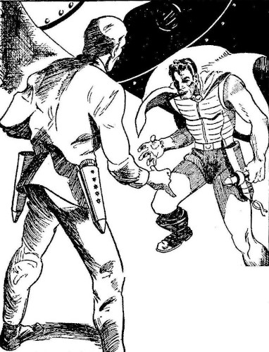 Stellor Downing's rapid rise up through the ranks of the Solar Guard was legendary on Mars. His swinging gait was more or less known to all theater-going Martians, and the sound of his voice over the radio was familiar. He wore a double modine belt, with one of the nasty weapons on each hip—where they crossed over his stomach, a dull silver medallion held them together.