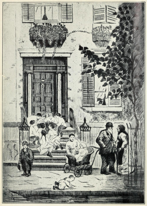 The child led me over broken roadways,—there was no asphalt, although its use was well established in other parts of the city,—over dirty mattresses and heaps of refuse,—it was before Colonel Waring had shown the possibility of clean streets even in that quarter,—between tall, reeking houses whose laden fire-escapes, useless for their appointed purpose, bulged with household goods of every description. The rain added to the dismal appearance of the streets and to the discomfort of the crowds which thronged them, intensifying the odors[5] which assailed me from every side. Through Hester and Division streets we went to the end of Ludlow; past odorous fish-stands, for the streets were a market-place, unregulated, unsupervised, unclean; past evil-smelling, uncovered garbage-cans; and—perhaps worst of all, where so many little children played—past the trucks brought down from more fastidious quarters and stalled on these already overcrowded streets, lending themselves inevitably to many forms of indecency.