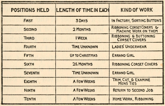[6] That the ephemeral character of work available for children of fourteen to sixteen years of age is not peculiar to New York City is shown by the following figures from the report of the Maryland Bureau of Statistics for the year 1914. In Maryland, working papers are issued for each separate employment. The number of original applications in one year was 3,580 and the total of subsequent applications, 4,437. Of the 3,580 children 2,006 came back a second time, 1,036 a third time, 561 a fourth, 363 a fifth, 194 a sixth, 116 a seventh, 53 an eighth, 29 a ninth, 18 a tenth, and one child came back for the eighteenth time in a twelvemonth, for working papers. Many of the children told stories of long periods of idleness between employments.—The Author.