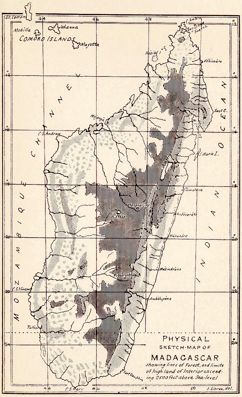 I have long wished that someone far more competent than myself would write a popular book upon the natural history and botany of this great island; but as I have not yet heard of any such, I venture with some diffidence to add this book to the large amount of literature already existing about Madagascar, but none of it exactly filling this place. For many years I edited, together with my late friend and colleague, the Rev. R. Baron, the numbers of The Antanànarìvo Annual, a publication which was “a record of information on the topography and natural productions of Madagascar, and the customs, traditions, language and religious beliefs of its people,” and for which I was always on the look-out for facts of all kinds[7] bearing on the above-mentioned subjects. But as this magazine was not known to the general public, and was confined to a very limited circle of readers, I have not hesitated to draw freely on the contents of its twenty-four numbers, as I am confident that a great deal of the information there contained is worthy of a much wider circulation than it had in the pages of the Annual.