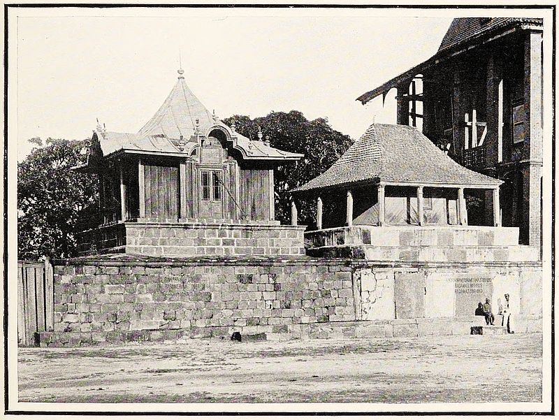 Presently we were invited to enter, the governor coming out to meet us, and brought us into his house, a rather smartly furnished place of one large room, but with a wide gallery all round it. Here we were glad to rest after our hot voyage and walk, and enjoyed an excellent cup of coffee, which they kindly made for us, as well as some of Huntley & Palmer’s “best mixed biscuits.” We felt as if we were getting back into a civilised land again! After a little while we moved into the chapel, which was also within the ròva; this was a large building, and looked quite gay, from being completely papered with good wall-paper, but badly laid on, for the native workman evidently thought that the white edging to each piece was a part of the pattern, and so had carefully left it visible in every case! The wooden posts of the roof were all papered too. The pulpit was a curious example of its kind, being made of lattice-work, gaily painted, with a number of small looking-glasses let into its front, and backed by wall-paper. It had a flat canopy or sounding board and a large door, so it was like a little room of itself. With its numerous doors and windows there was a beautiful breeze through the building, and we anticipated a comfortable night, but, alas! our hopes were not realised, for the heat was[306] intense, and the mosquitoes persecuted us by hundreds. This town is probably one of the hottest in the island, and we were told that later on, in the rainy season, the place is almost unbearable from the clouds of these insects.