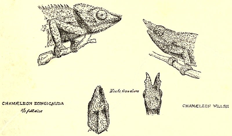 As we were walking about just before sunset, they brought us a chameleon, here called taròndro (Dicranosaura bifurca), about nine inches long and as much more in length of tail; it was dark brownish-grey in colour, with a white line along the sides, and the head and back serrated like a saw. The nose of the male has two compressed long horns covered with large scales. As we have already seen, Madagascar contains a considerable number of these reptiles, especially of species with remarkable processes on the head.