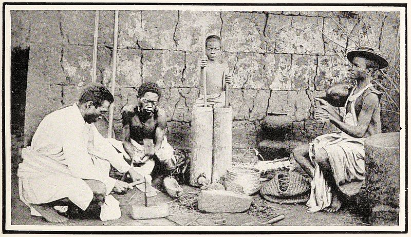 Arabic dress and customs were not less prominent in Mojangà. Close to our lodging was a small mosque, and from the flat roof we could hear the muezzin calling the faithful to prayers five times a day in a long sonorous musical cry—before sunrise, in the forenoon, at noon, at three o’clock, and at sunset, and could see his form silhouetted against the sky, making a number of prostrations when the call was finished. Our stay here was in the month Ramazan, the great fasting-time of the Mohammedans, when they eat and drink nothing all day, at least the strictly orthodox do not. They make up for it, however, at night; and feasting and jollity seemed to be the general employment. Our house adjoining the main street, it was extremely noisy until long after midnight. There is no doubt that the Arabs, and also the Indians, have been settled at Mojangà, as well as at other places on the north-west coast, for centuries. As we have seen in Chapter XII., there was an Arab colony at some remote period on the south-east coast, but this was gradually absorbed and lost in the native population and no longer maintains a separate existence. The north-western colony, however, being in constant communication with Suahili land and the Arab element there, has maintained its individuality, and kept its dress, customs, language, and religion quite distinct from the Malagasy around it.
