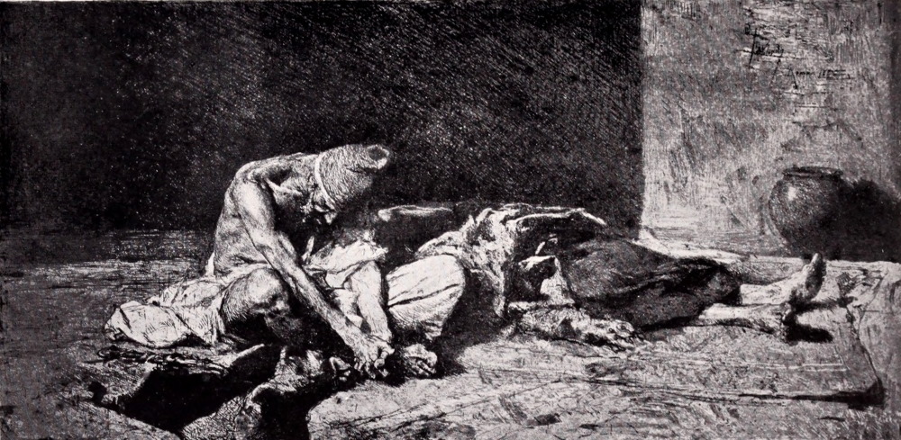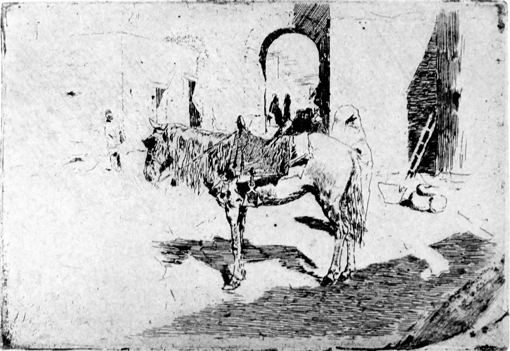 Perhaps I have said too much already, for Mr. Webster’s work is well able to speak for itself. But there is one noteworthy feature, common to all his plates, that claims attention, and that is his power of rendering sunlight. If he loves dark and dingy thoroughfares with dilapidated roofs and moldering plaster, it is for the sake of those quaint shadows that peep from their recesses and climb the high walls, and still more for the patches of brilliant, quivering sunlight to which the shadows give so full a value. He seems to hear, like Corot, the actual crash of the sun upon the wall—“l’éclat du soleil qui frappe.”