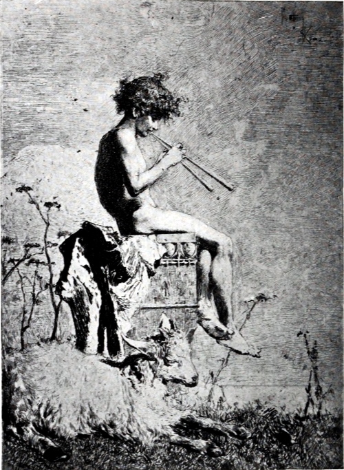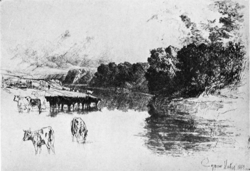 He calls etching his diversion, which accounts for the uniformly high quality of this side of his art. [Pg 261]Done for the sheer love of it, as other men would ride horseback or play golf, these plates are the product of a joyousness that is the mother of all great art. It is typical of him that he should have taken up the practice of this exacting though elusive art merely as an amusement, as he himself says, “with which to while away odd hours, instead of sitting at home or going about for entertainment.” This is characteristic of his whole life and harks back to the genesis of his artistic career when, as a mere lad, he carved in birch-wood with his clasp-knife images of the flocks he tended in the Dalecarlian forests. Even in those early days this son of humble peasant folk revealed a power of lifelike characterization that did not pass unnoticed by these shrewd, clear-eyed peasantry whose sole criterion in matters of art was whether or not the counterfeit presentment looked like the original. And in these small carved images of cows and sheep they found a striking resemblance to their models that aroused their keenest admiration. His first patron was one of these peasant folk, a shepherd friend of his, who bought from him a carved statuette of an enraged cow for which Zorn received in payment a sou and a little white loaf. To make his sculpture more lifelike he used to imitate antique statuary by tinting his work. His palette was the palm of his hand, in which he mixed a composite of bilberry juice and certain coloring substances obtained from little forest flowers.