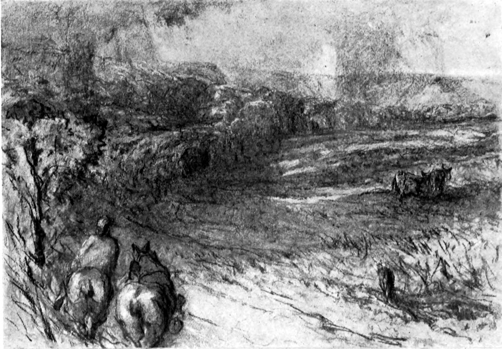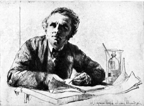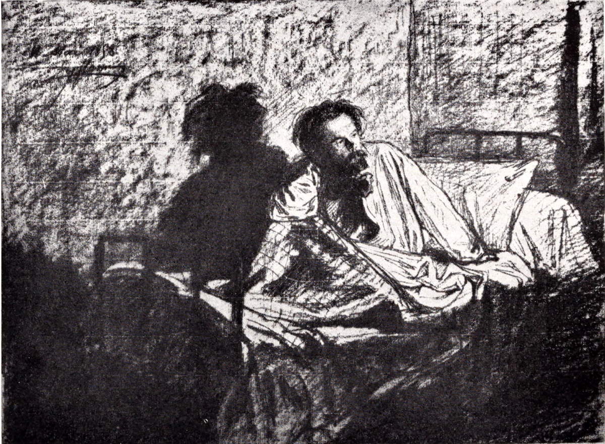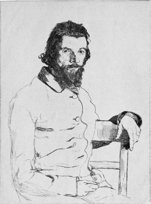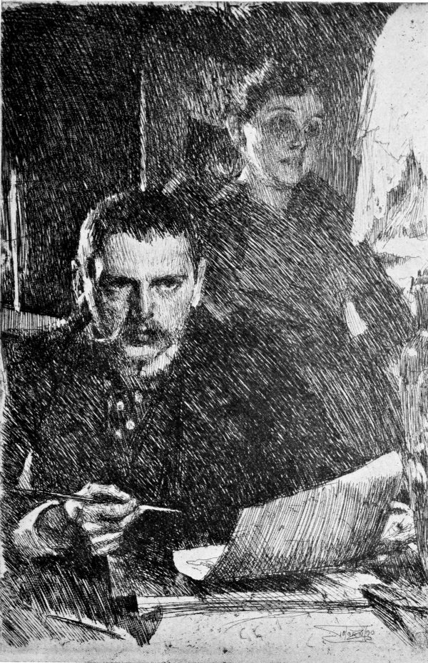 Strongly opposed to all the conventionalities of the studio, he abhors posing as much as he dislikes monogamy, preferring to study his subjects under natural conditions when they are off their guard and then to transcribe his impressions very largely from memory, after the essential lines have been noted. Thus have come into being some of his most memorable plates, such as the Renan, and the portrait of himself and his wife, each executed in a few hours of concentrated effort. The very swiftness with which these impressions have been recorded has no doubt contributed much toward giving them that convincing finality which, paradoxically enough, are theirs in a preëminent degree no matter how casual may appear the means by which this effect has been achieved. That is the impression left upon one by his illuminating portrait of the pontifical-looking Renan, for example.