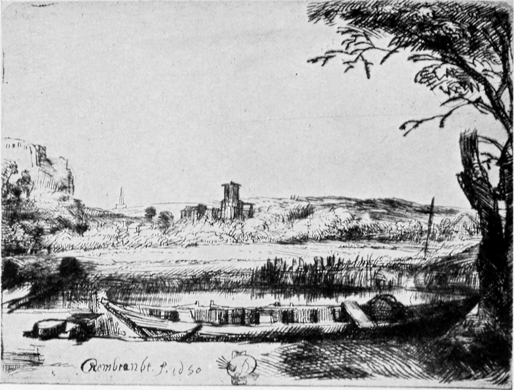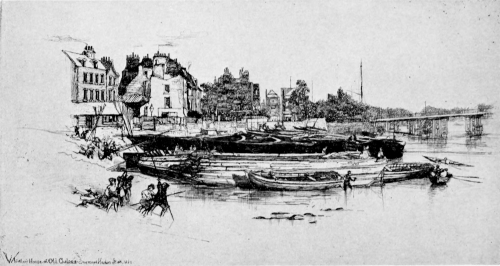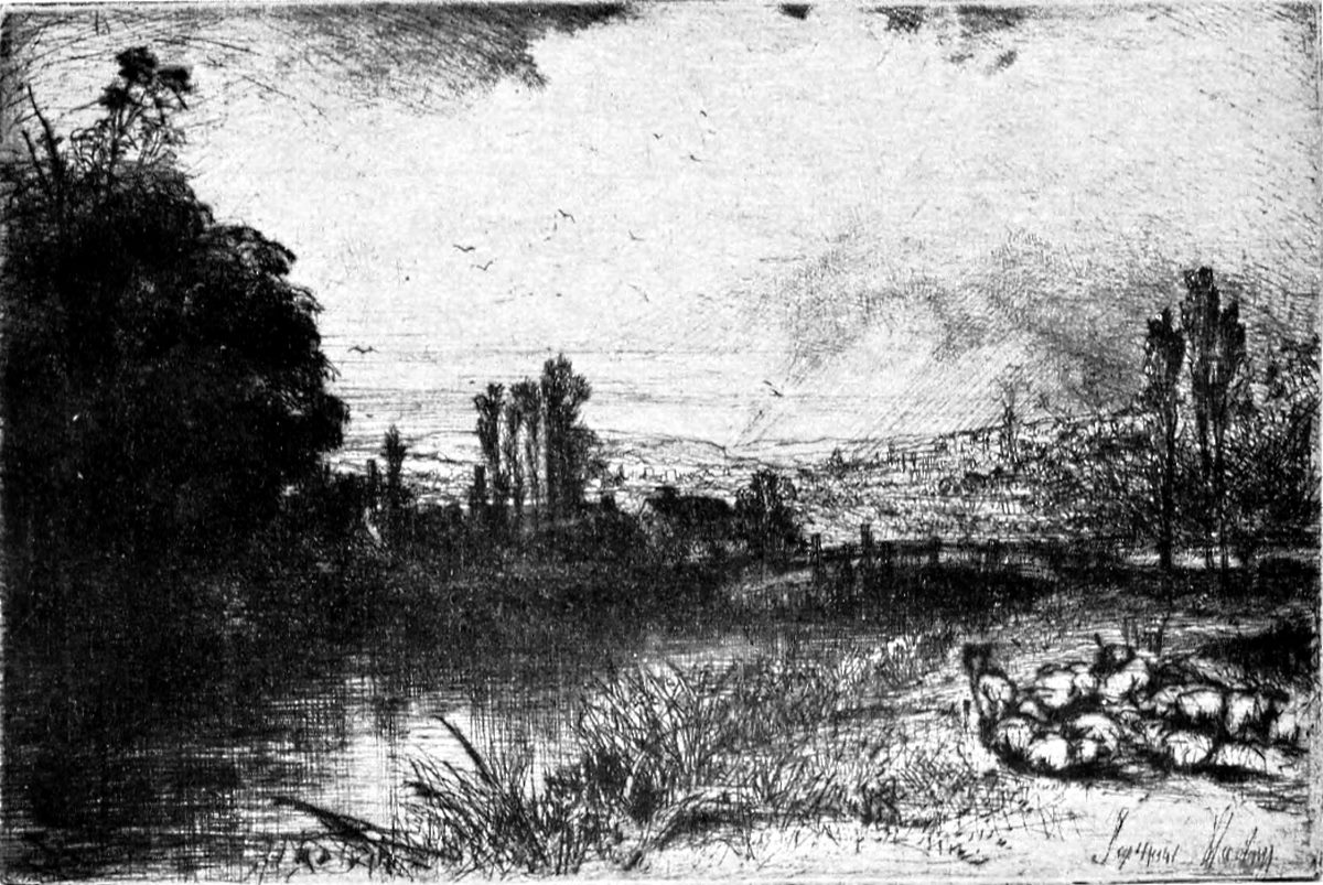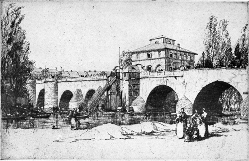 Two etchings of old bridges over the Main at Frankfort must rank among the best work that Webster has yet produced. One is a small and spirited plate showing the tower of the cathedral and a row of houses, most delicately drawn, rising with a beautiful sky-line above the solid mass of the shadowed bridge with its heavy buttresses. The other shows the old bridge that spans the Main between Frankfort and Sachsenhausen. Legend tells that in compensation for finishing the building within a certain time the architect made a vow to sacrifice to the devil the first living being that crossed the bridge. Then, when the fatal day arrived, he drove a cock across, and so cheated the devil of his due. Much the same story of outwitting the devil is told about the building of the cathedral at Aix-la-Chapelle. Whether Webster ventured upon any compact I do not know; but this plate, in its building, in its well-constructed composition, in its splendid effect of brilliant sunshine, is one of the most successful tasks he has ever accomplished. The group of figures on the near bank, happily placed like those in Vermeer’s famous View of Delft, adds no little to the charm of the scene. I would set this plate beside Les Blanchisseuses and the Quai Montebello, which Mr. Wedmore has found “modestly perfect,” as representing the very summit of Webster’s art.