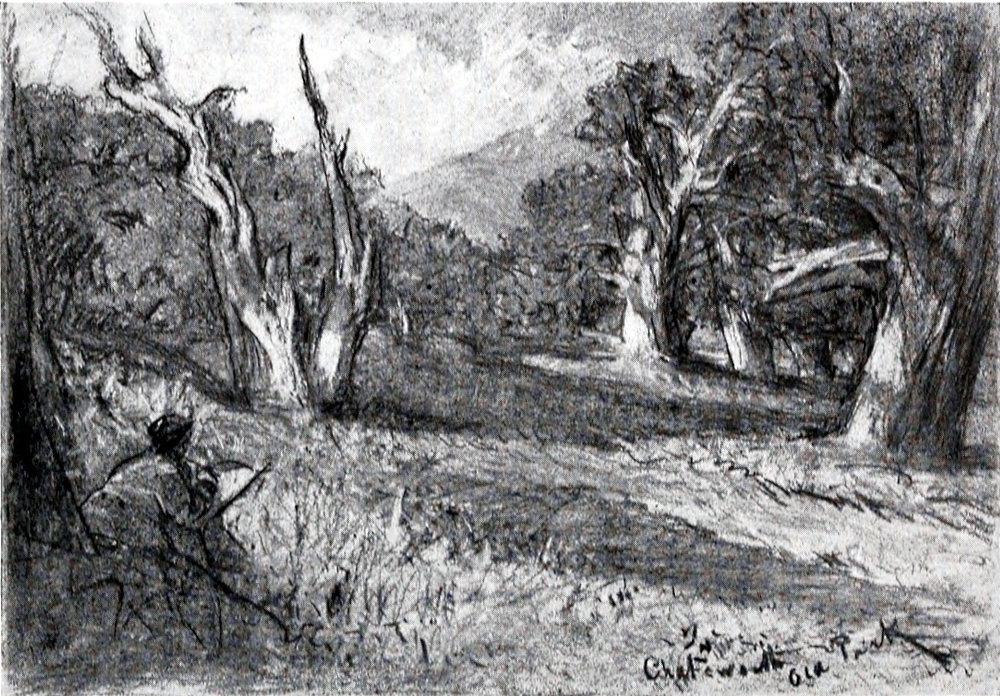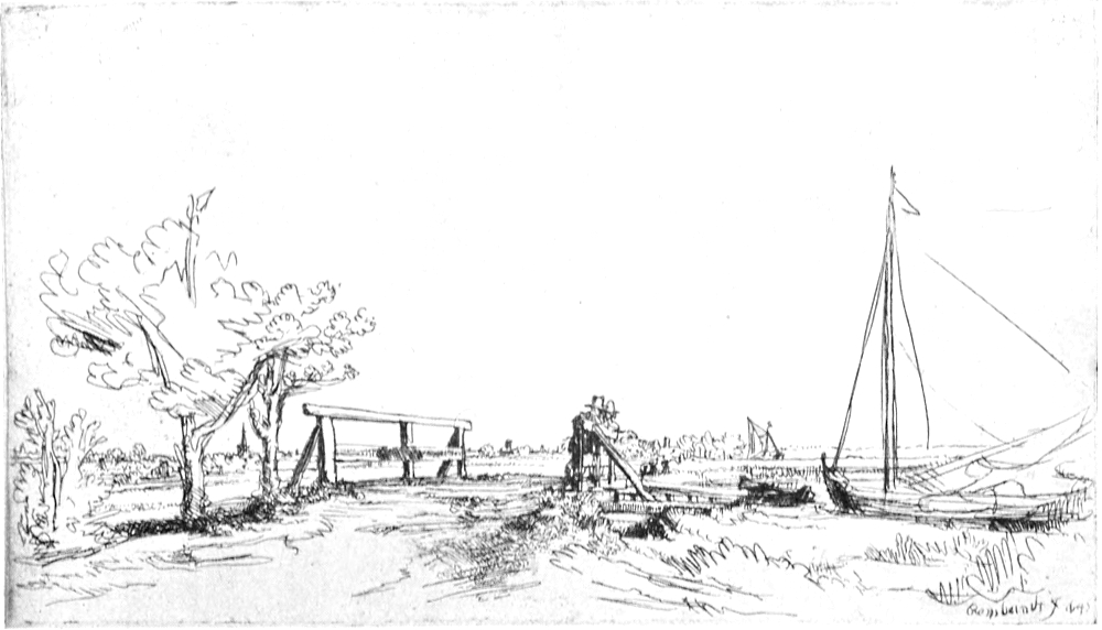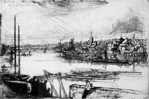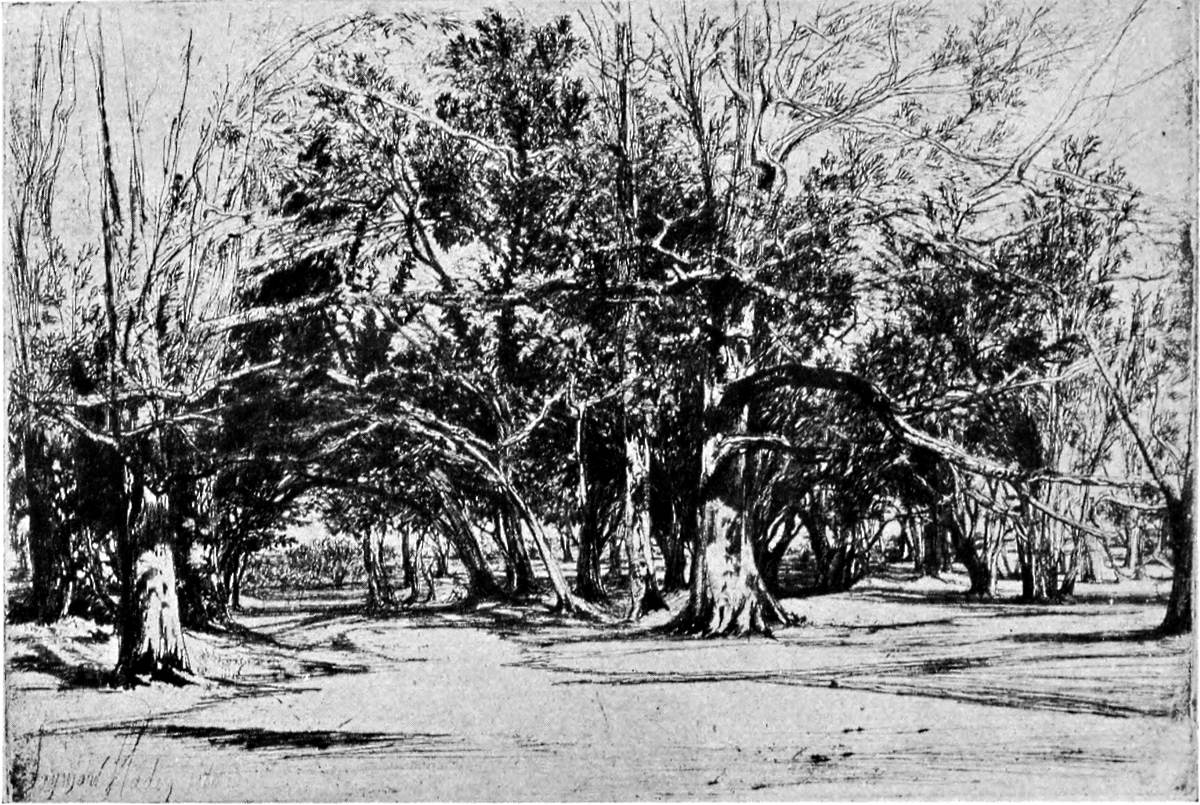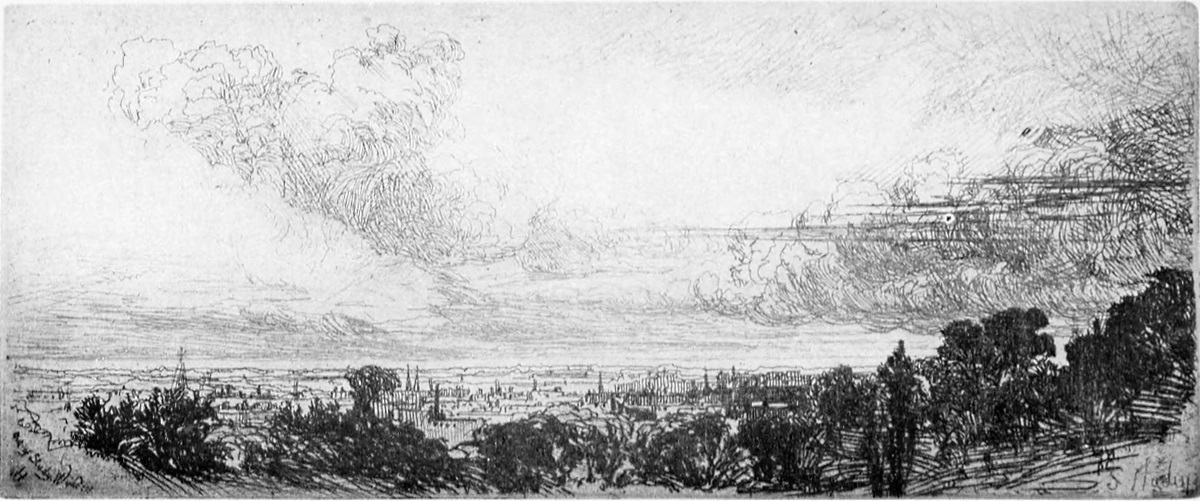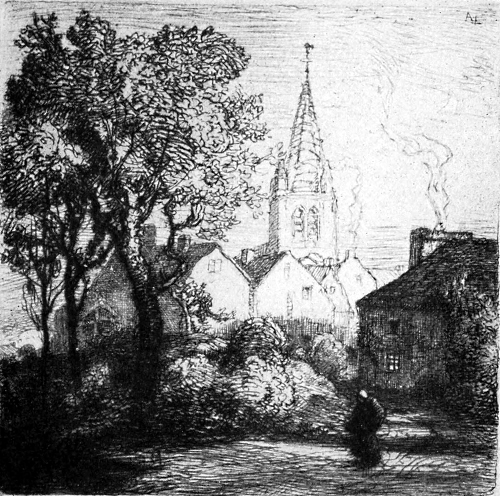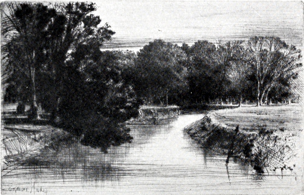Mr. Webster has not learned from Meryon at the cost of his own individuality, and one reason for the freshness that characterizes his work is that he is one of those who like to transfer their first impressions of nature direct to the plate in the open air. With very few exceptions, that is how his etchings have been made. A certain amount of work is necessarily done afterward in the retirement of the studio, but the straightforward method of rendering nature gives a vividness and spontaneity that careful work from intermediate studies in pencil or color can rarely produce. This spontaneity is the very essence of good etching, for with etching, as with water-color, its highest charm is inevitably troubled by mechanical labor; it is essentially a method of which one feels that “if ’twere done, ’twere well done quickly.” The etcher should no more be able to stay the quick gliding of his needle in the middle of a line than the skater to stand still upon the outside edge. And I think that the etcher who works straight from nature is more apt to search out the notes and accents of character and to seize upon those structural lines which are a fundamental necessity to his work.