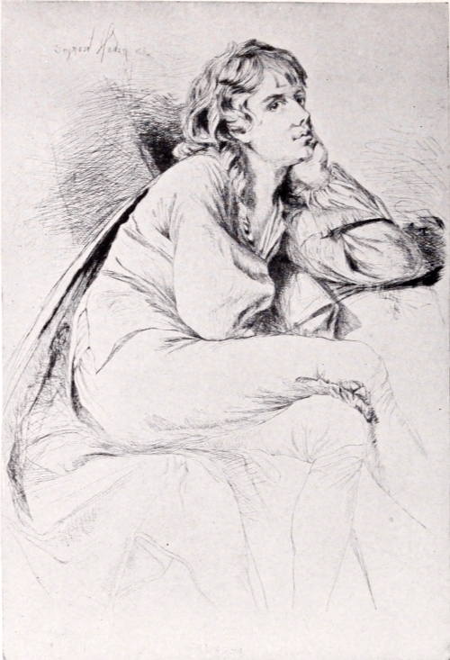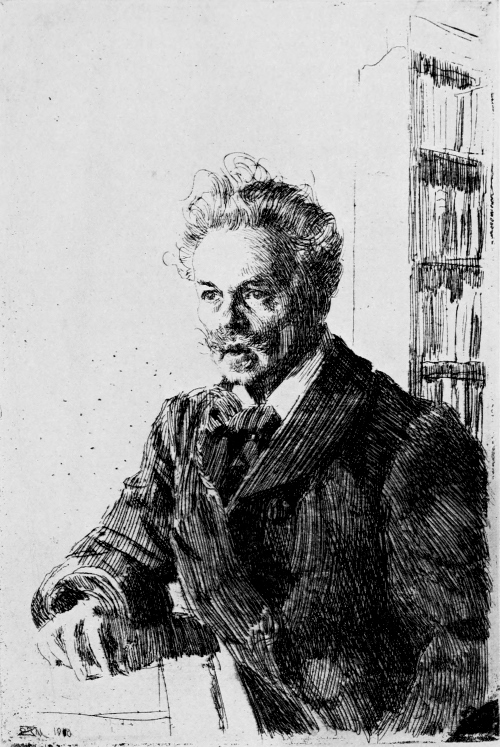 Here is set down for all time in a few unerring lines the soul and body of the man—the casuist and the voluptuary of thought, the Balzacian bulk of him physically and the bigness of him mentally. The massive and apparently grotesque exterior of this speculative dreamer, immersed in his own meditations, conveys something of the same sense of aloofness with which Rodin has invested his statue of Balzac. They both appear to be dreaming of life and its mysteries until the immense torso seems but an Olympian pedestal supporting the domelike head. It is more than a pocket-edition biography, this portrait. Executed in one sitting in Renan’s study in April of 1892, nine years after his initiation into the mysteries of etching, this plate may be said to epitomize the whole art of Zorn,—his vigorous truthfulness, his synthetic treatment of salient points of character, and his love of dramatic contrasts of sharply juxtaposed masses of black and white. Moreover, it furnishes a striking exposition of the purely technical side of his art in which he has created for himself a highly original and personal method. No one has eschewed more rigorously than he the “happy accidents” employed as a convenient cloak by masquerading incompetents, foisting their meaningless scrawls on a bewildered public, to whom etching has become synonymous with a pretty dilettantism that is within the easy reach of every aspiring fledgling of art. These parallel, slanting strokes that seem to cut and divide the form into unrelated sections are really the expression of an accurate and well-defined intention that manifests itself in the extraordinary verisimilitude of the figure and its adroitly suggested accessories. [Pg 264]It is like a fleeting glimpse in a mirror in which the impalpable spirit of reality is reflected, evoking by some mysterious incantation the most fugitive nuances of expression and gesture with the slightest inflection of his modeling.