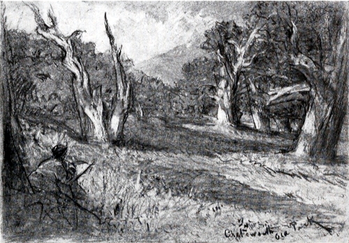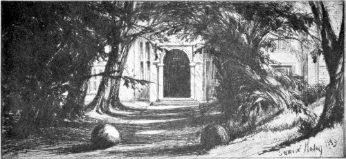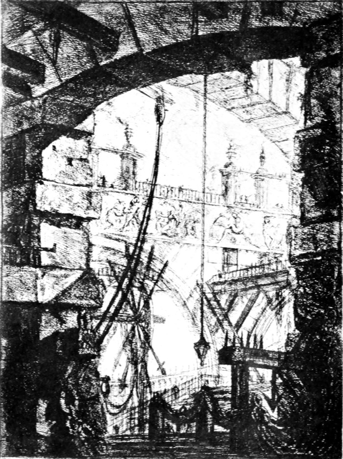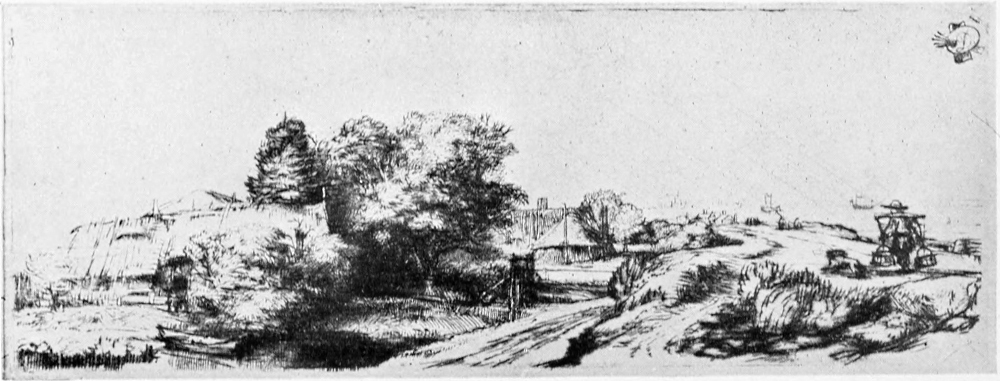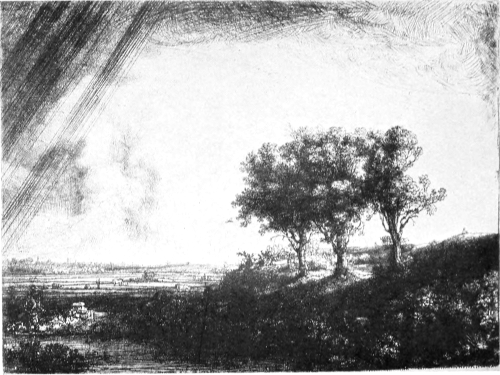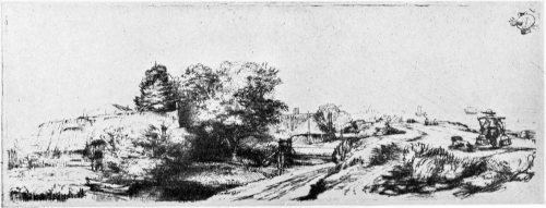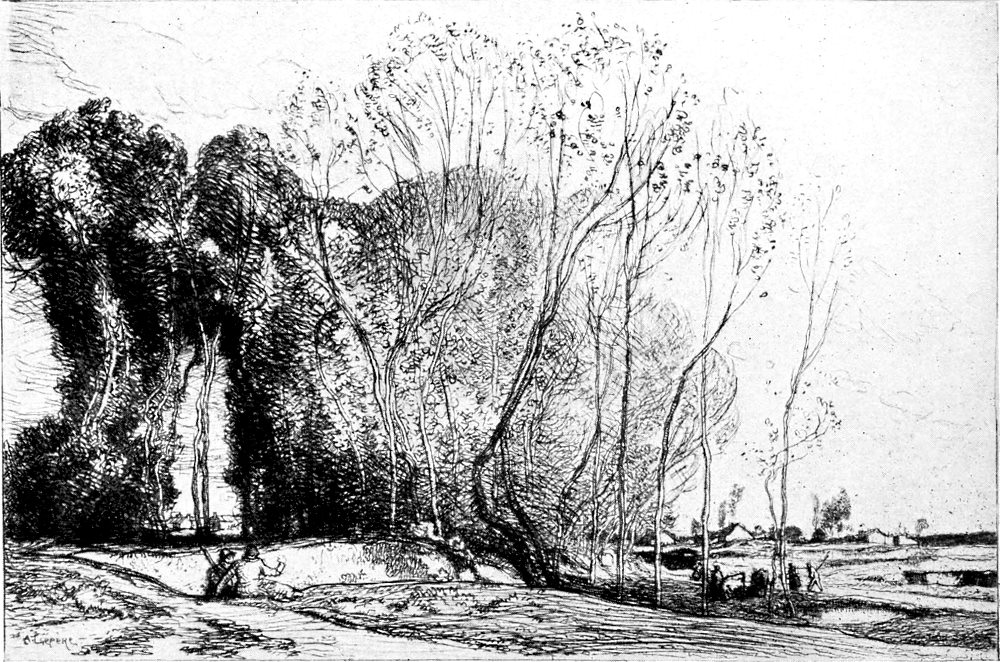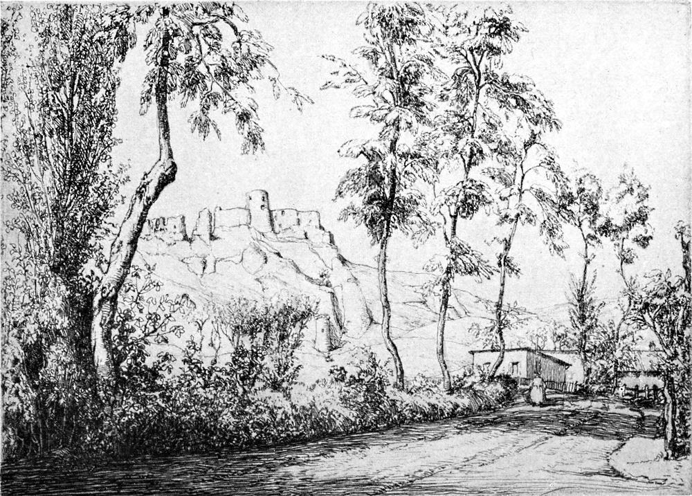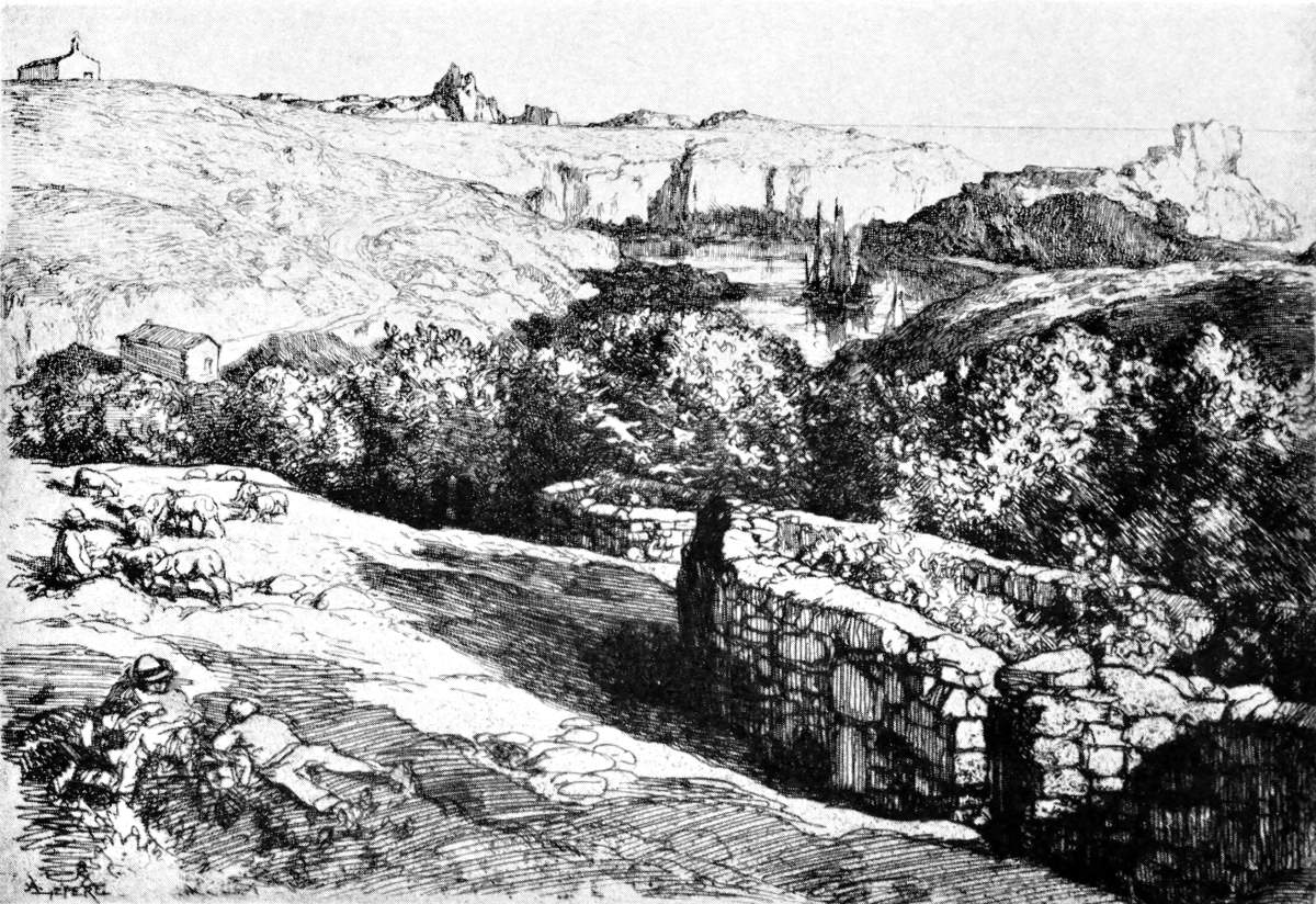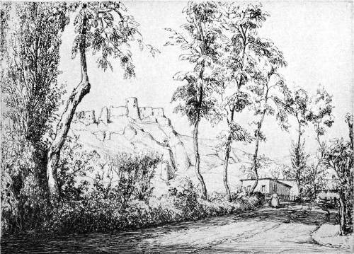 Since writing the above, I have seen working-proofs of two new etchings of landscape. And here, too, there is high promise. They show, at least, that Webster is not going to remain a man of one subject; that he is opening his heart to the beauty and romance of simple nature. He has sought his first themes in that pleasant countryside where, between tall poplars, you[Pg 258] get peeps of Château Gaillard, nobly set upon its hill. In landscape, as in his architectural work, Webster sets his theme upon the plate with fine skill of arrangement and with exquisite draughtsmanship. These two plates, Château Gaillard and La Route de Louviers, are exhilarating in their feeling of sunshine, and they please by their absolute simplicity of statement. They are honest, and without artifice. Printed “as clean as a whistle,” without any of the doubtful expedients that give a meretricious attractiveness to so much modern etching, they appeal by their rightness of pattern and precision of line. Those who see high promise as well as present fulfilment in Webster’s art, will not regret that he has left the town and set out where