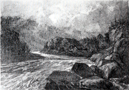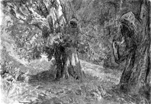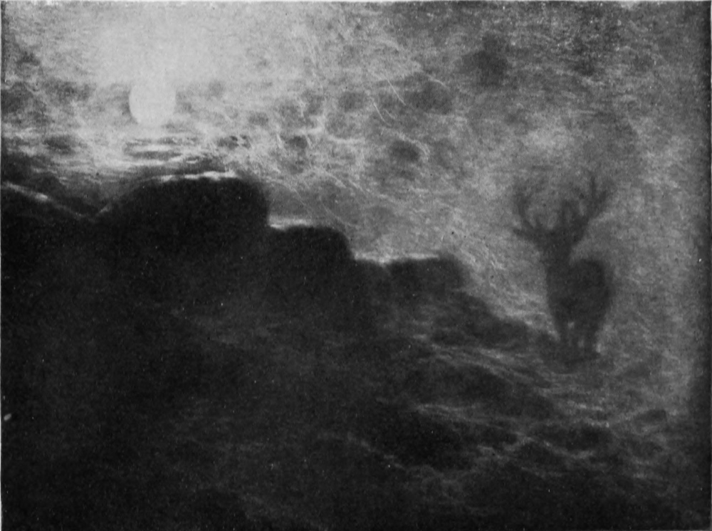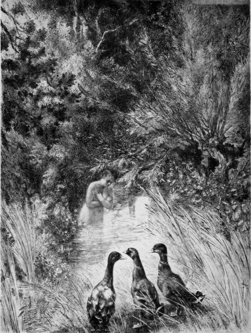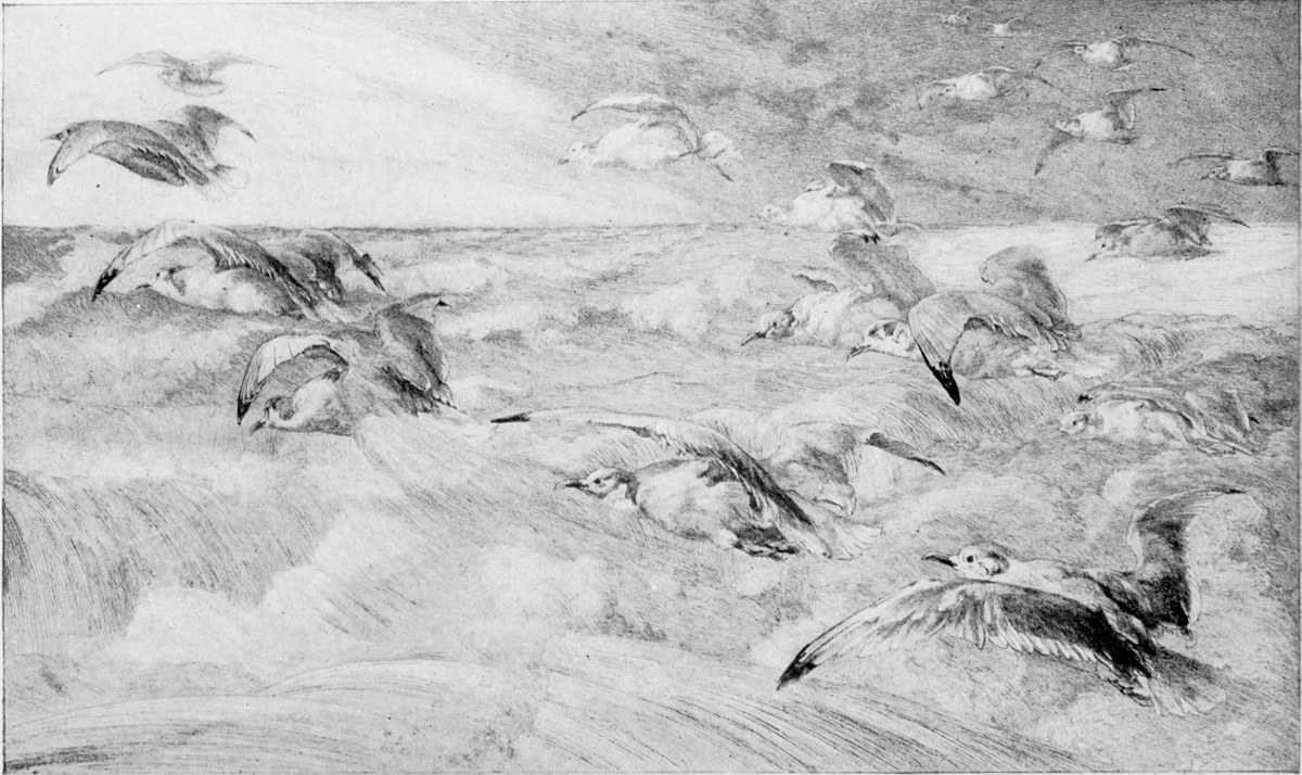 The nudes of Rembrandt would look singularly coarse and heavy by comparison with these silvery, exquisitely modeled Brunhildas of Zorn, who disport themselves on the sunlit beach or emerge from the enveloping shadow of some protruding cliff with a childlike unconsciousness and a pagan naïveté that disarms prudish prejudices. In its supple grace and vibrant vitality the delicately modulated back of the bending figure of The Bather—Evening is a pantheistic hymn to the eternal efflorescence of life. She pauses in the silvery twilight, before breaking the surface of the mirror-like lake into a thousand jewels of refracted light, and she is as much a part of the enshrouding stillness as the aged rocks on which she stands. Whistler never did anything more evanescent than the landscape of this plate, which is printed in a key as light and airy as the magically executed[Pg 268] lines, that give the softness of the figure’s contours as well as the hardness of the rocks and the veiled serenity of distant lake and woodland. It is a splendid affirmation of the extremely delicate sensibilities possessed by this most vigorous and brilliant of contemporary etchers, whose art is one of the most powerful and significant manifestations of the re-awakened æsthetic impulse of the twentieth century.
