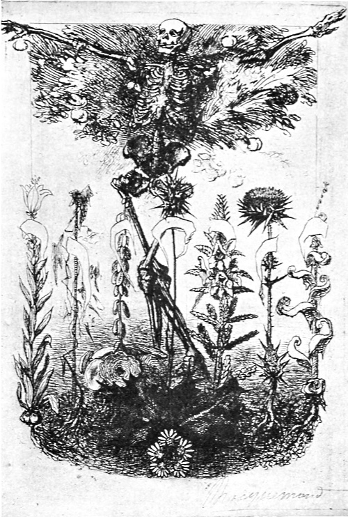 His admiration of those sky-scrapers found expression in a series of drawings made on behalf of The Century Magazine, and in, at any rate, one etching—the Cortlandt Street, New York. The subject will appeal most, perhaps, to those who live beneath the familiar shade of these monstrous habitations, with their hundreds of staring eyes; but the ordinary man, though he may find it strangely uninspiring and unromantic, will at any rate admire the firm decision of the drawing and welcome the slender filaments and trembling gray spirals of smoke—so difficult to express in line with a point of steel—that cast a veil over the sordid reality of the scene. Though Webster carried that one plate to a finish, he was still obsessed by all sorts of doubts. Many drawings were torn up, and many plates that he etched were wilfully destroyed. Just as the golfer falls victim to too much [Pg 253]reading of theoretical works, so for Webster his eager indulgence in theory and science put him “off his game.” I say all this to account for what must seem a small output during two years for a man whose sole work is etching. It is all to the artist’s credit; but, none the less, we have suffered, nous autres, for his convictions. Now, however, Richard is himself again. A month or more spent in Frankfort this summer has produced a series of pencil-drawings and etchings which should bring satisfaction and content both to the artist and to all who admire his work.