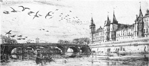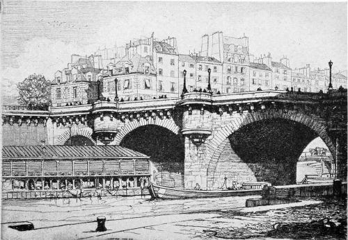 Another plate of this “Quartier Marais” series is a noble representation of Notre Dame seen from an unusual aspect. It is a drawing from near the Hôtel de Ville and shows the splendid mass of the cathedral rising above the irregular houses that face the Quartier Marais and the Quai aux Fleurs. There is freedom and charm in the treatment of the foreground, [Pg 246]where a little tug puffs along the river and the big barges move cumbrously under the lee of the near bank, and in the middle distance where the light plays pleasantly over the old houses; but the roof of the cathedral itself, put in with unpleasing rigidity of line, comes like cold fact in the middle of romance. It is as though Meryon here had imposed his weakness as well as his strength upon Mr. Webster, for in the Morgue, for instance, the one small blemish is the ruled precision of the lines upon a roof. A fitting companion to this vision of Notre Dame is Le Pont Neuf, another of the etcher’s largest and most distinguished plates. The stern solidity of the bridge, with its massive masonry, its corbeled turrets, and its deeply shadowed arches, makes pleasing contrast with the irregular sky-line of the sunlit houses that rise beyond.