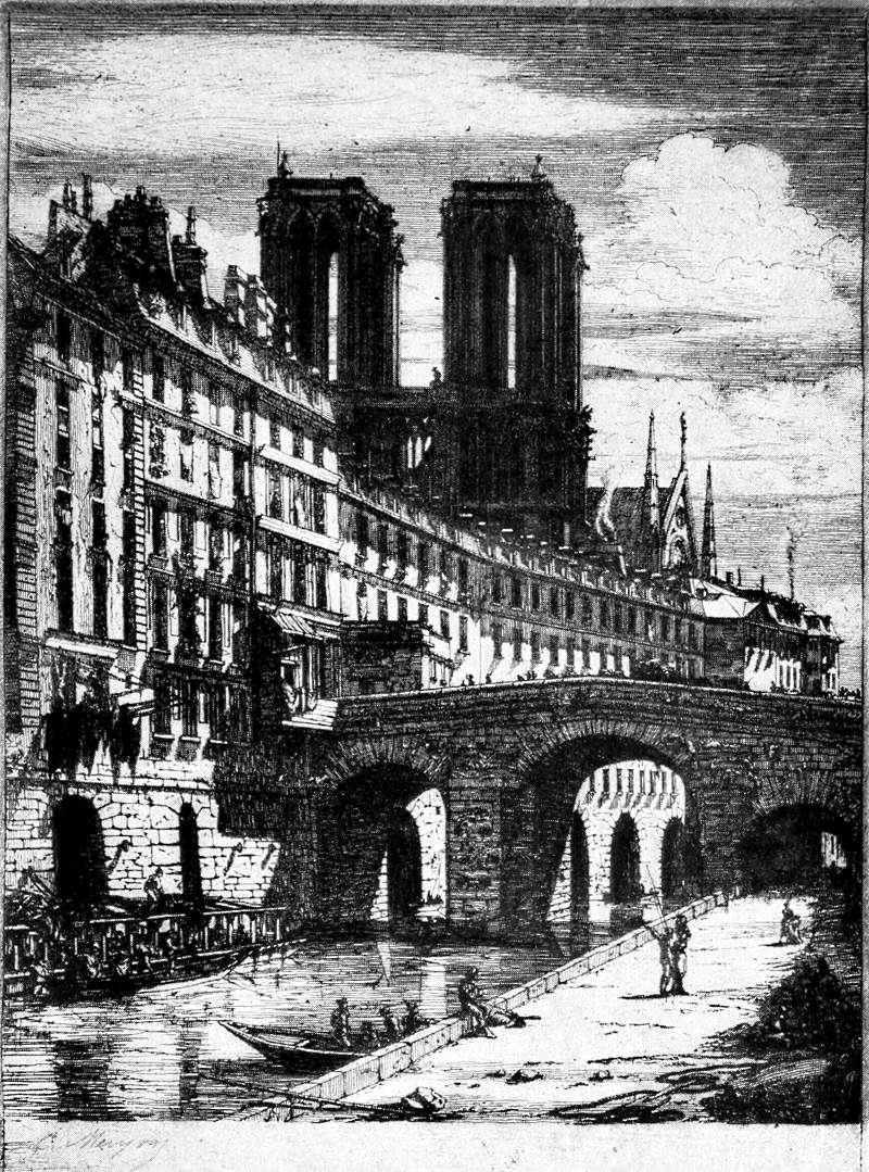“A fitting companion to this vision of Notre Dame is Le Pont Neuf, another of the etcher’s largest and most distinguished plates. The stern solidity of the bridge, with its massive masonry, its corbeled turrets, and its deeply shadowed arches, makes pleasing contrast with the irregular sky-line of the sunlit houses that rise beyond.” Martin Hardie.