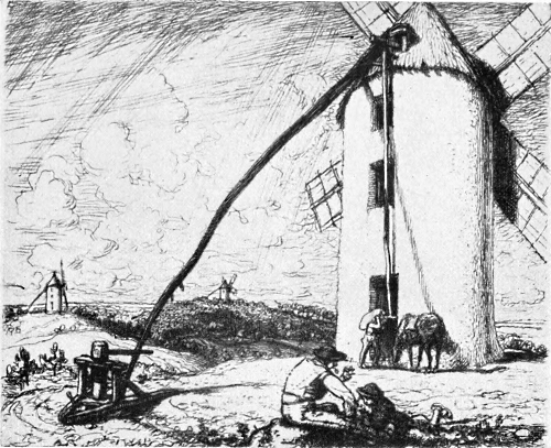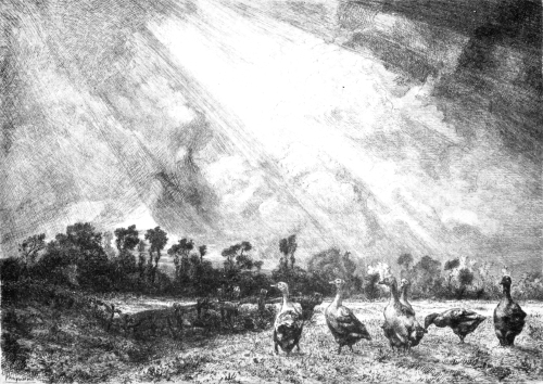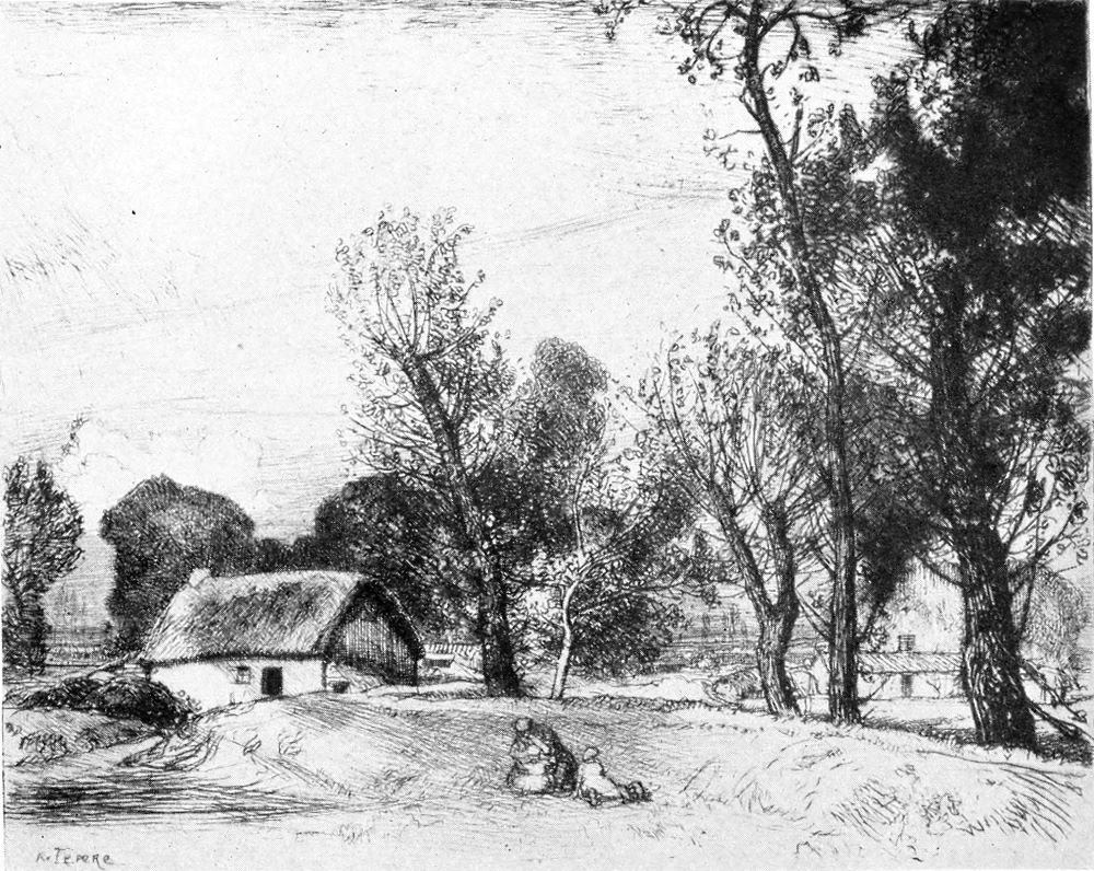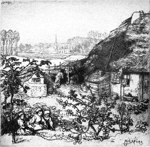 In studying the work of a young etcher—and Mr. Webster is still young as an etcher—it is almost always possible to trace certain influences which, quite legitimately, have acted upon his choice of subject and his technique. In one of his first etchings, The Court, Bourron, the Whistler influence is frankly apparent. Les Blanchisseuses is in no sense an imitative plate, but I should have said it was the work of a man who knew Whistler’s Unsafe Tenement by heart. And there comes in the critic’s danger of leaping to rash conclusions, for Mr. Webster tells me he never saw that print by Whistler till long after his etching was made. For the Meryon influence, which is clearly apparent in much of his work, Mr. Webster makes no apology. Nor need he do so; for if he reminds us, here a little of Whistler, there a little of Meryon, there is always a large measure of himself besides. The true artist lights his torch from that of his predecessors: it is his business to carry on great traditions. “I have done my best simply to learn from him, not to steal” [Pg 249]—that is Mr. Webster’s own expressive way of putting it.