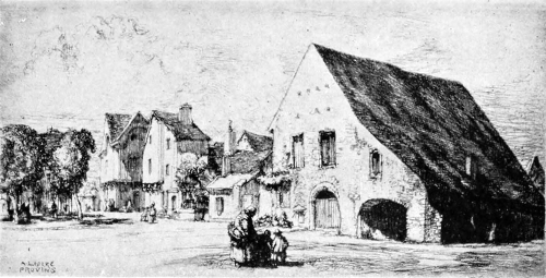 It is of some of the chief works produced and exhibited during the last three years that I have now to speak, and in doing so may perhaps indicate a few leading characteristics of the etcher’s work. His chief [Pg 243]delight is in the nooks and corners of old-world thoroughfares and culs-de-sac, where deep shadows lurk in the angles of time-worn buildings, and sunlight ripples over crumbling walls, seamy gables, and irregular tiled roofs. Of such is a series of subjects found in old Rouen—the St. Ouen; the Rue du Hallage, where the cathedral spire towers high above old timbered houses; and that charming plate with the title Old Houses, Rouen, a quaint corner of tenements whose high-pitched roofs stand propped against one another for all the world like a castle of cards. The etcher of this and of the St. Ouen was welcomed with warm sympathy by the Gazette des Beaux-Arts, which said that “never before has there been so fervent and skilled an interpreter of the bowed timber and crumbling plaster of the old houses of Rouen, which line the street ending in the cathedral with its pointed spire against the open sky.” And so we pass to two courtyard scenes—belonging, like the Rouen subjects, to the year 1906—the Cour, Normandie, and Les Blanchisseuses. In both we find the artist becoming more adept in using broad and balanced disposition of light and shade to give not merely chiaroscuro but the suggestion of actual color, and more skilled in adding exquisiteness of detail to refined truth of visual impression. Les Blanchisseuses, in particular, with its rich mystery of shadow, with its sunshine falling on white walls and lighting the seamed interstices of plaster and timber, has an indefinable charm that, for myself at any rate, makes it a high-water mark in Mr. Webster’s art. Of similar type is the Old Butter Market, Bruges, where a cobbled street curves beneath a shadowed archway; and then for variety you step from Bruges la Morte,[Pg 244] from the silent cobbles that centuries ago were a busy thoroughfare for ringing feet, to the Bruges of to-day. It is Bruges in a very different aspect, this free and spirited study made on July 27, 1907, on the day of the Fête de l’Arbre d’Or, giving a quick impression of gay holiday crowds, of banners fluttering against the open sky, and of the “belfry old and brown” whose carillon inspired America’s poet, as its tall form and fretted outline have inspired the American etcher of whom I write. This Bruges en Fête, and Paysanne, a clever and direct figure-study of an old peasant at Marlotte, come as an episode of pleasing variety in Mr. Webster’s work, and tend to show that, though he has his preferences, he is not really fettered by any limitation of subject or treatment.