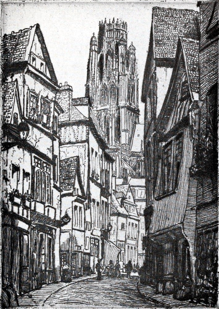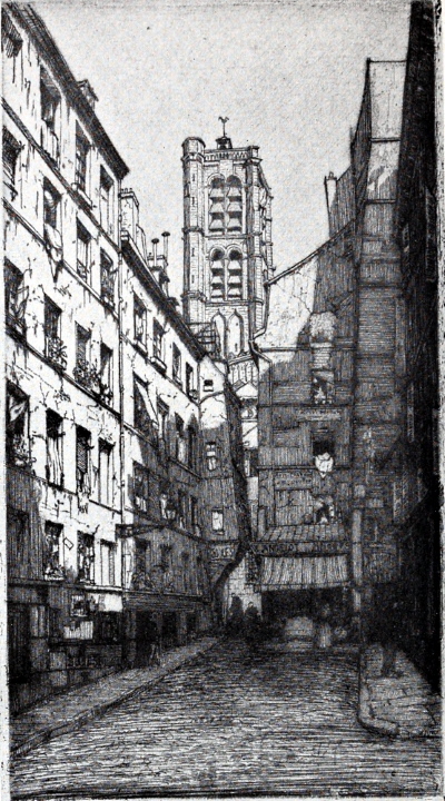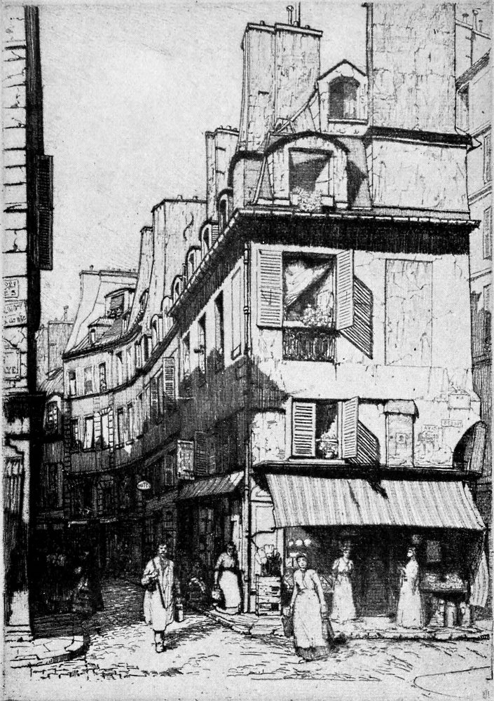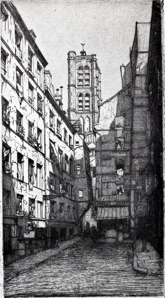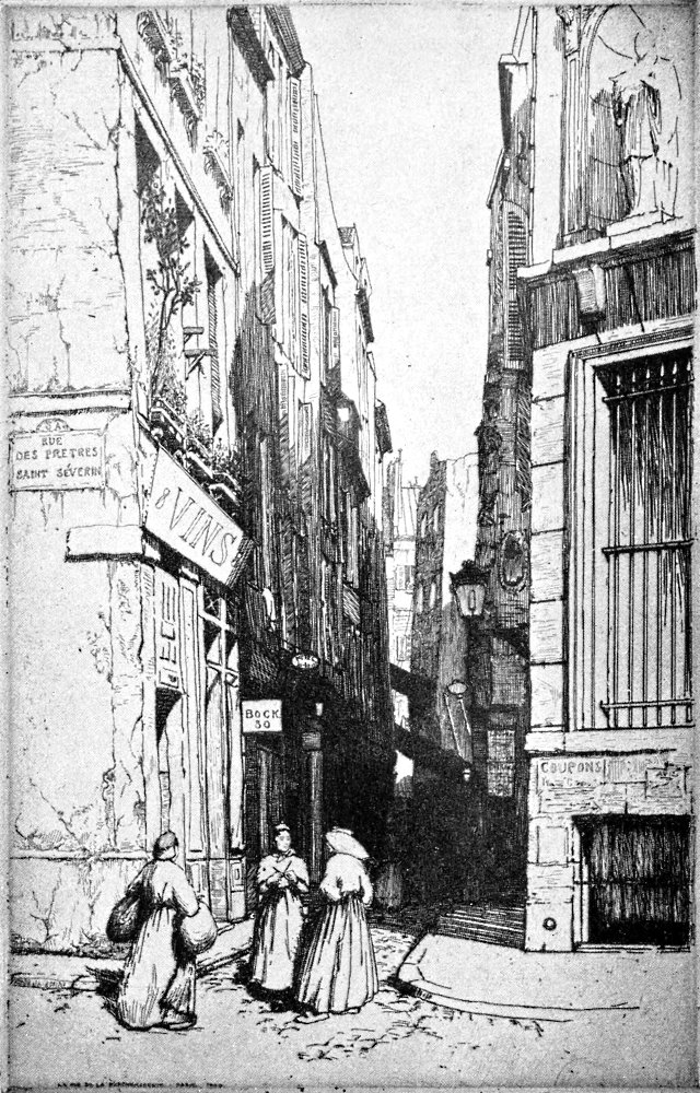 “Closely akin to Rue Brise Miche in restful balance of composition and in fine shadow effect is the Rue de la Parcheminerie—of special value now, for the old street has disappeared largely since the making of the plate.” Martin Hardie.