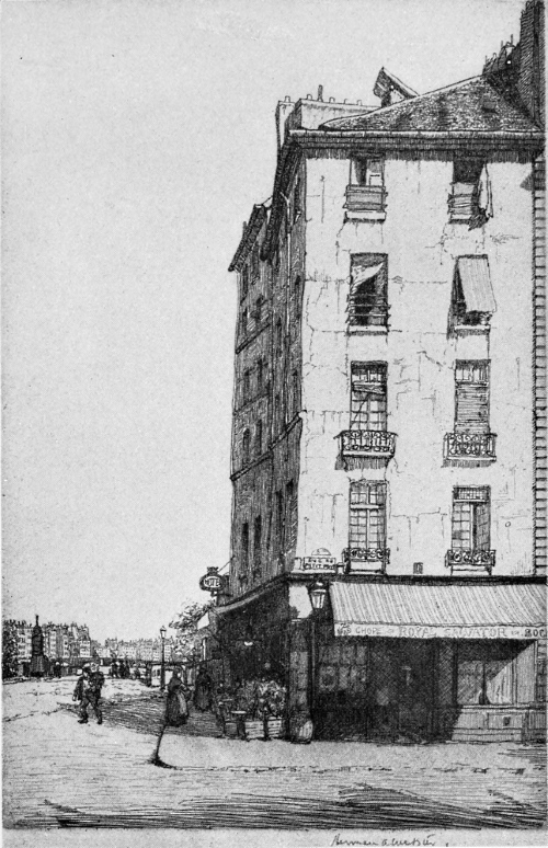 It is but natural that an artist of Mr. Webster’s temperament, a devoted admirer of Meryon, should become absorbed in Paris herself and endeavor to put upon copperplate the “poésie profonde et compliqué d’une vaste capitale.” The Bruges and Rouen plates showed Mr. Webster to be keenly susceptible to the magnetism and charm of medieval tradition, but Paris, steeped in sentiment even more than Rouen or Bruges, was to rouse a still greater warmth and feeling. He began by searching out those picturesque streets in the old quarters that have survived the wholesale demolishment of Baron Haussmann, a name hated by artists as that of Granger by lovers of books. The Rue Brise Miche found its way to the Royal Academy, and was also honored by publication in the Gazette des Beaux-Arts (July, 1907). Closely akin to it in restful balance of composition and in fine shadow effect is the Rue de la Parcheminerie—of special value now, for [Pg 245]the old street has disappeared largely since the making of the plate. La Rue Cardinale has affinity of general treatment, and is not the less interesting for an amazing tour de force in the rendering of color and texture in the striped blind over a shop-front. A fourth plate, perhaps even finer than any of these in its force, directness, and concentrated simplicity, is the Rue Grenier sur l’Eau. There is much of Meryon in its clear, crisp line-work. Some day perhaps these loving studies of the old Paris of Balzac may be gathered in a series illustrating the “Quartier Marais,” and published in an édition de luxe with descriptive text by the etcher. Let us hope that this may come to pass, for the buildings that Mr. Webster depicts are far more than a prosaic record of architectural features. There is a spiritual and human suggestiveness behind the mortar and bricks of his pictures: as a poet of his own nation has it, they are “latent with unseen existences.” He has appreciated the fact that etching—an art hedged in by limitations and depending upon power of suggestion—is the one art that can give at once those delicate lines, those broad shadows, those crumbling bits of texture. The lover of etching can regard his subject with indifference, and take full joy in the soft play of sunlight, the fine choice of line, the effective massing of light and shade.