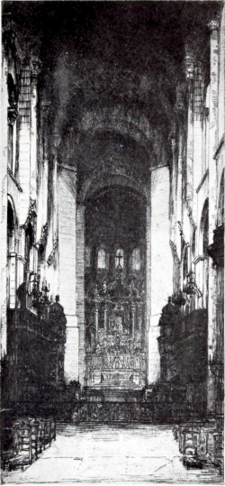 Gothic canopies and tracery are drawn with loving care in the Porte des Marmousets, St. Ouen, Rouen, but here again it is the mystery of shadow in the deep porch that supplies the true theme. A church porch has also supplied the subject of one of Mr. Webster’s latest works, Notre Dame des Andelys. The ordinary observer will delight in the print for its beautiful rendering of a noble fragment of architecture. Those who have real knowledge of etching will appreciate it still more for its clever biting and for its subtle delicacy of line so cunningly used for the indication of stone, glass, and woodwork with their different surfaces and textures.