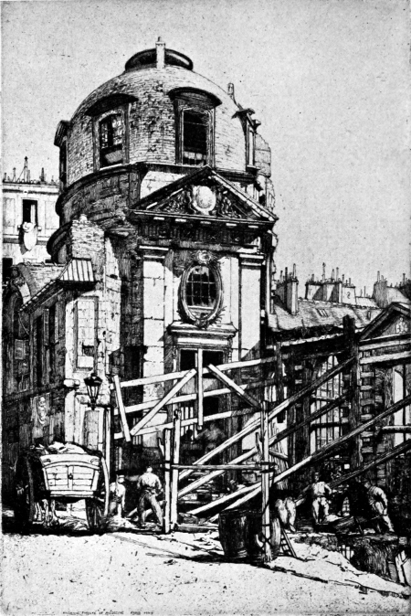 “The artist’s subtle perception of light and his refined draftsmanship have been used to singular advantage in the Ancienne Faculté de Médecine, 1608. One is grateful to him for his fine record of this domed building that was a little gem of Renaissance art, though there is a note of sadness in the substructure of balks and struts set at its base by the ruthless hand of the destroyer.” Martin Hardie.